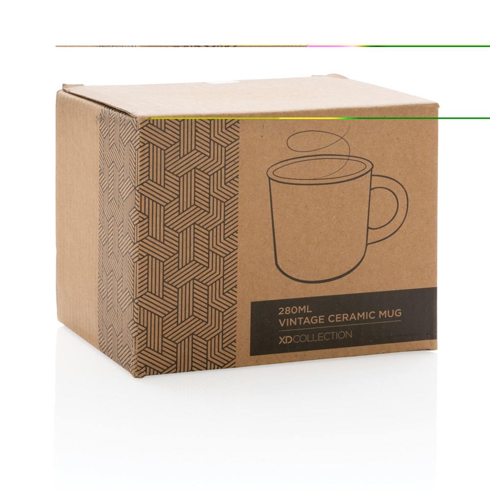 This mug is made from ceramic for durability and lasting use. The mug has a vintage look and features a curved handle for easy grip. Dishwasher safe in accordance with EN12875-1 (at least 125 washing cycles) for all decoration methods. Packed in gift box. Capacity 280ml.