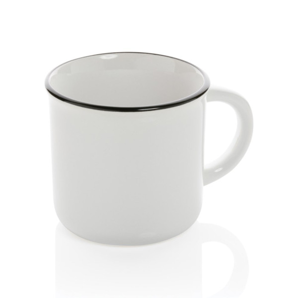 This mug is made from ceramic for durability and lasting use. The mug has a vintage look and features a curved handle for easy grip. Dishwasher safe in accordance with EN12875-1 (at least 125 washing cycles) for all decoration methods. Packed in gift box. Capacity 280ml.