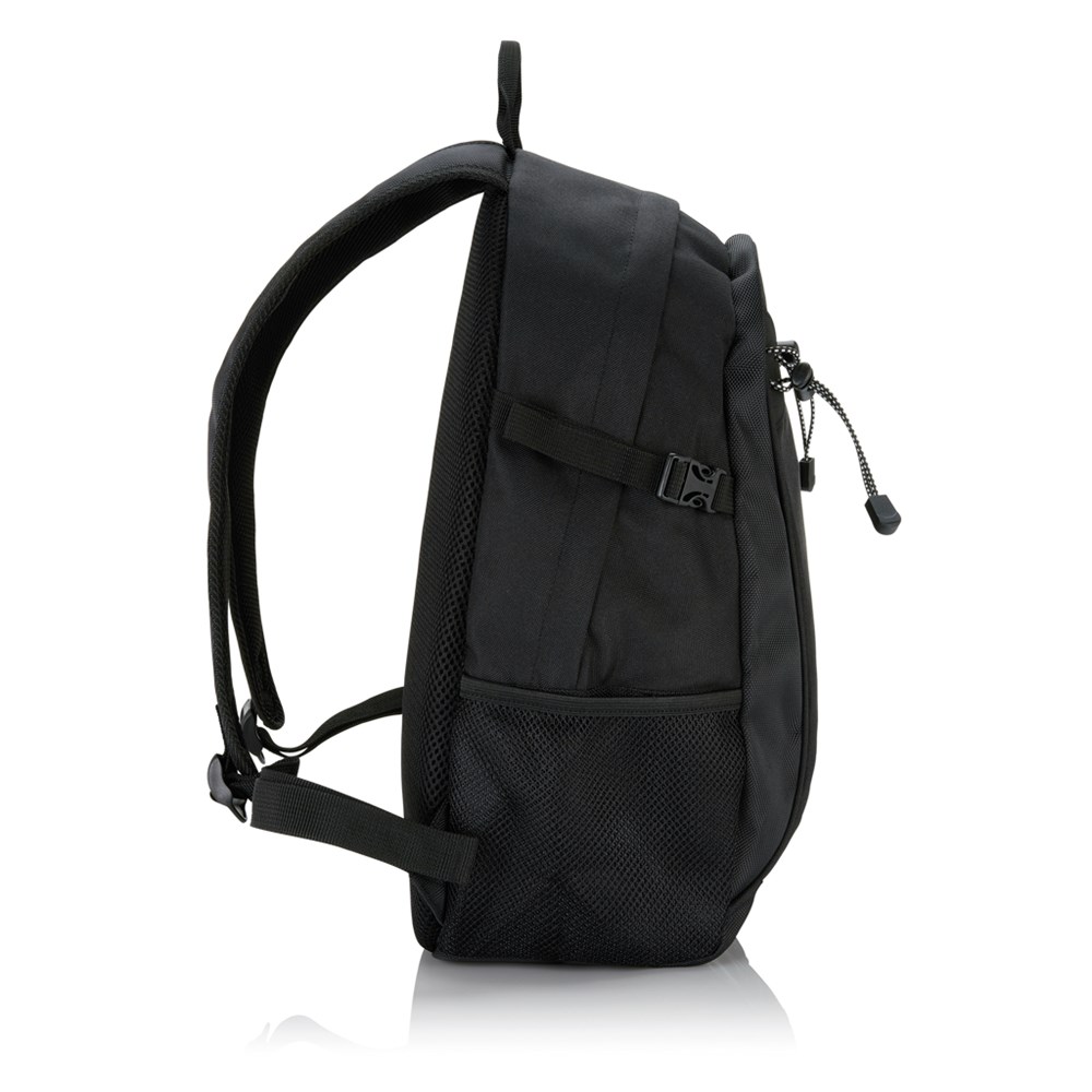 600D and 1680D polyester outdoor backpack with one large main compartment. Comfortable padded backpanel. Side mesh pockets can hold a water bottle or extra gear. PVC free.