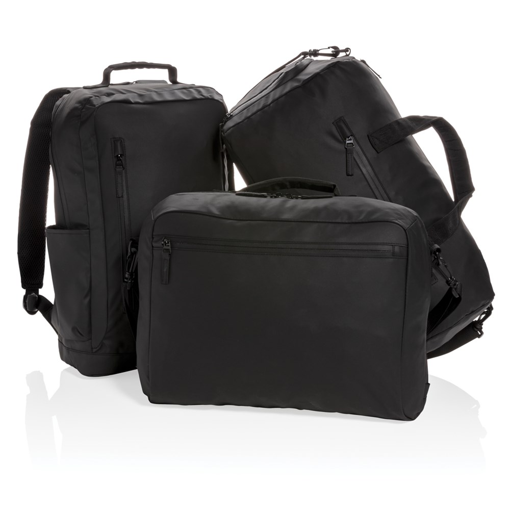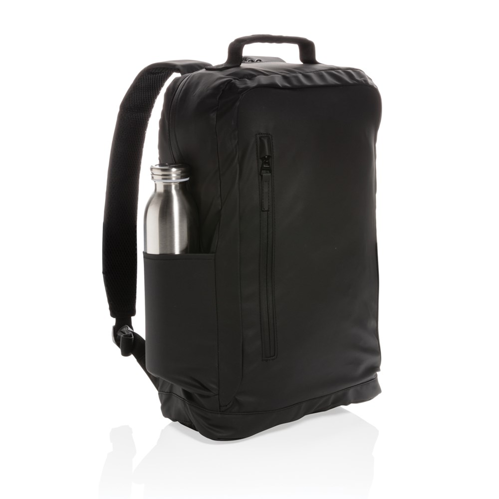 Look effortlessly stylish when carrying this all black laptop backpack. This bag holds a roomy compartment for all your gear and a laptop compartment that can hold a 15.6" laptop. PVC free.