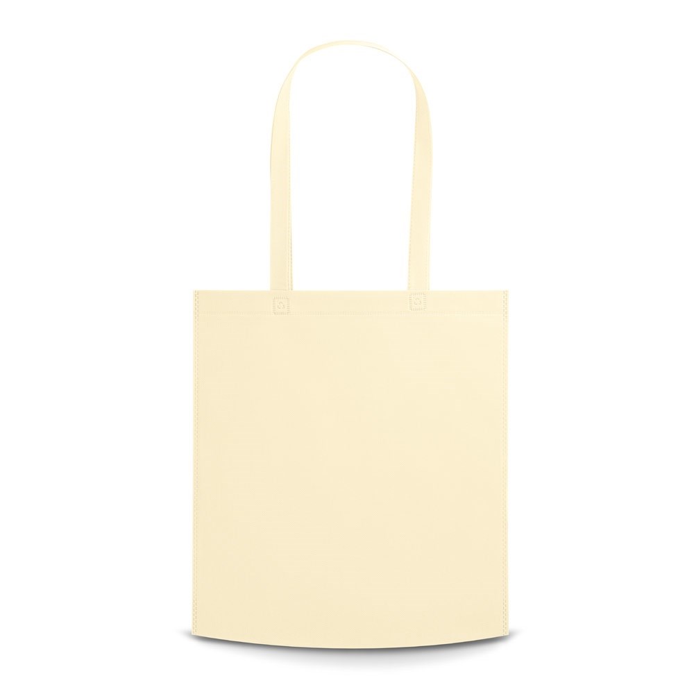 Thermo sealed non-woven bag (80 g/m²) with 75 cm handles. 380 x 415 x 85 mm