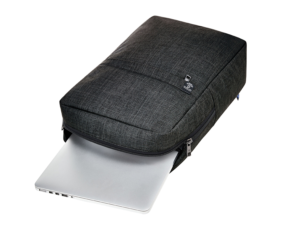 streamlined backpack: rPET outer material; large main compartment with 2-way zip and padded notebook compartment; front pocket with zip; elaborately padded back with hidden zip compartment; length-adjustable padded shoulder straps with rubber loops to attach items such as sunglasses; handle