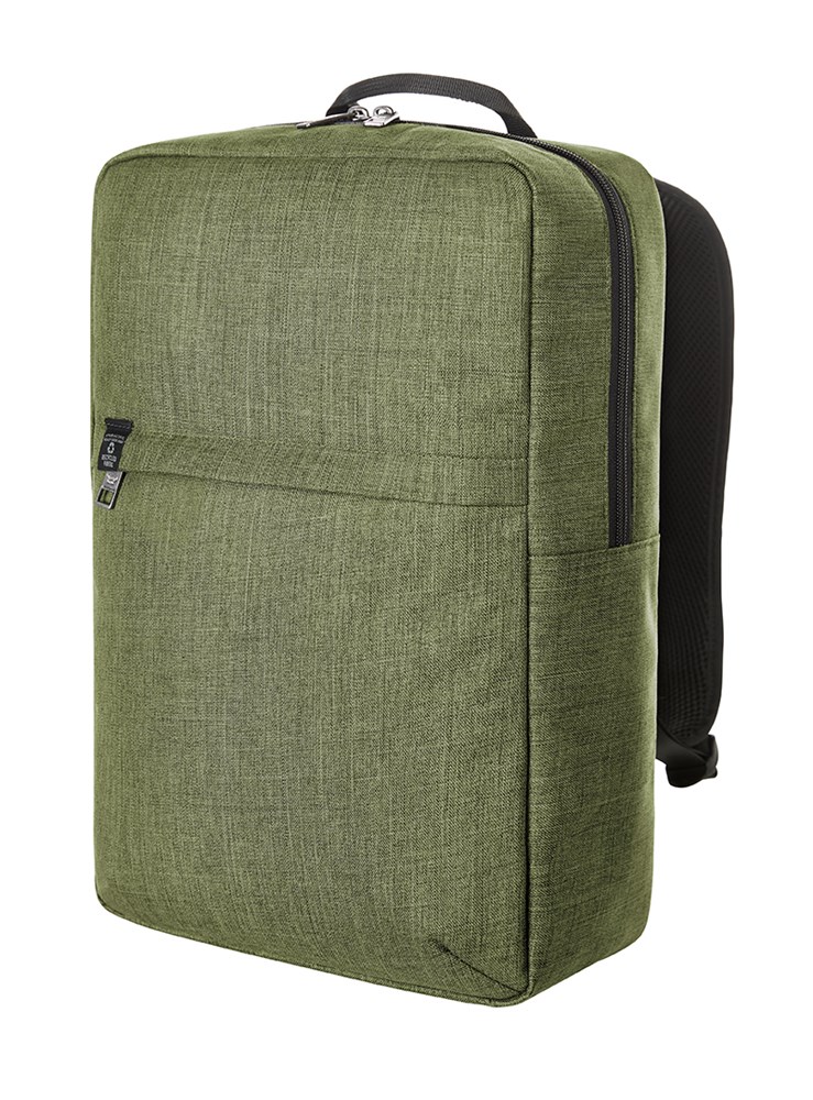streamlined backpack: rPET outer material; large main compartment with 2-way zip and padded notebook compartment; front pocket with zip; elaborately padded back with hidden zip compartment; length-adjustable padded shoulder straps with rubber loops to attach items such as sunglasses; handle