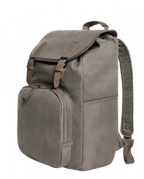 flap with adjustable decorative buckles and magnetic clasp; large main compartment with drawstring fastener; padded notebook compartment; front pocket with 2-way zipper; two flat insert pockets; handle with grip cuff; padded, adjustable shoulder straps; high-quality metal and PU suede faux leather accessories