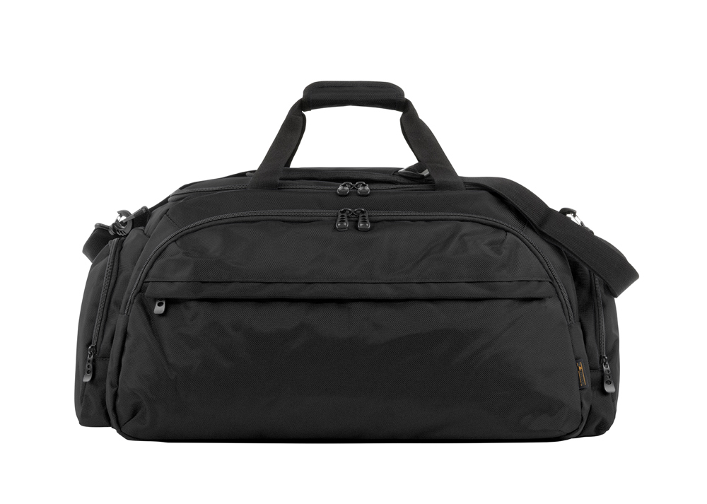 spacious main compartment with two-way zipper; 2 front pockets with zipper; 2 side pockets with zipper; removable, adjustable shoulder strap with comfortable shoulder pad; handles with grip cuffs; bottom studs