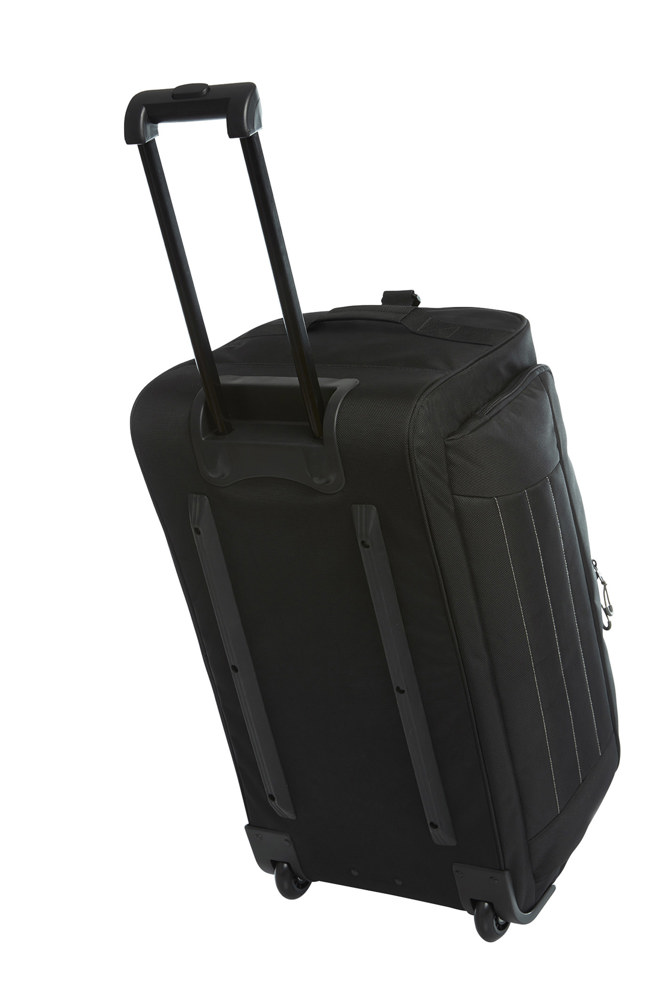 spacious zipper main compartment; zipper front pocket with decorative backstitching; telescopic pole; lightweight rollers; handles with padded grips; removable, length-adjustable shoulder strap with shoulder pad