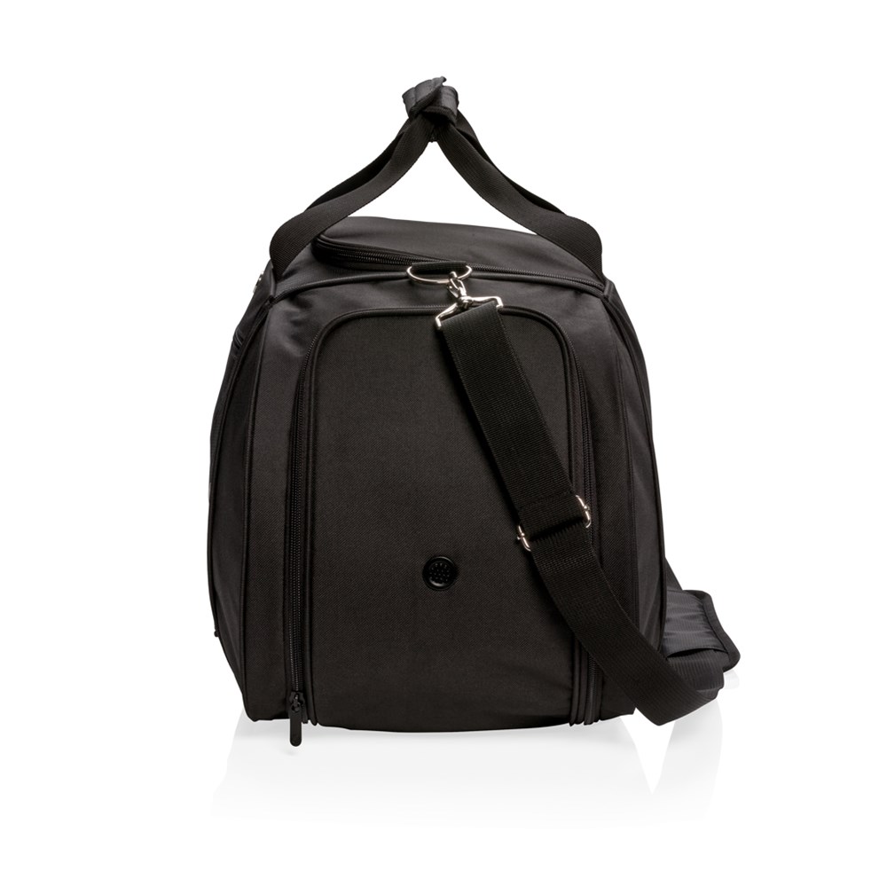 This 600D with 1680D polyester duffle bag offers sporty style for the gym or casual travel. Includes a roomy main compartment with a U-shaped top zipper closure, a side entry shoe compartment with air vent and a side bottle holder compartment. Front zippered quick-stash pocket for smartphones and other travel accessories. Adjustable shoulder strap and double top handles for carrying comfort and versatility. PVC free.