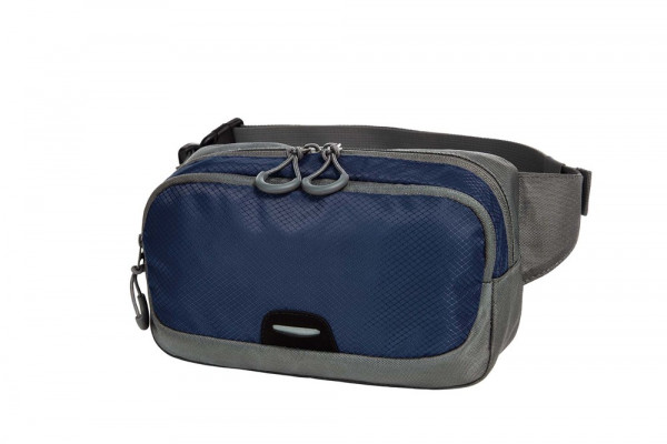 main compartment with 2-way zipper and inner zip compartment; front zip pocket; rear-side comfortable padding; front reflector stripes; length-adjustable and side-closing waist strap