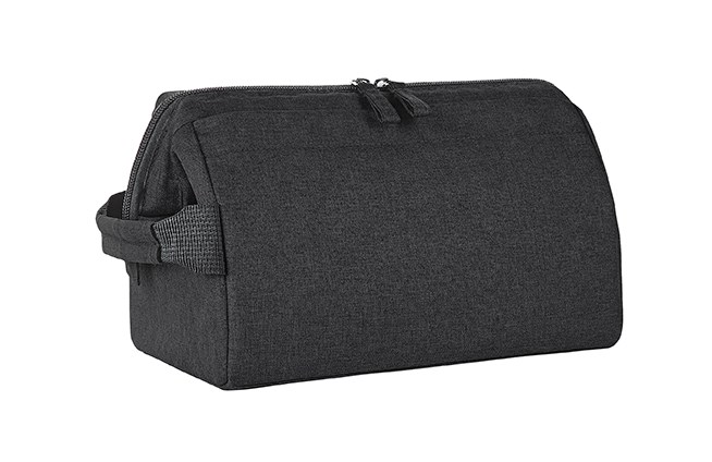 Stylish zip pocket bag with sturdy metal hoop opening for upright standing or hanging; rPET outer material; large, padded main compartment, with various organiser elements; front pocket with zip; handle