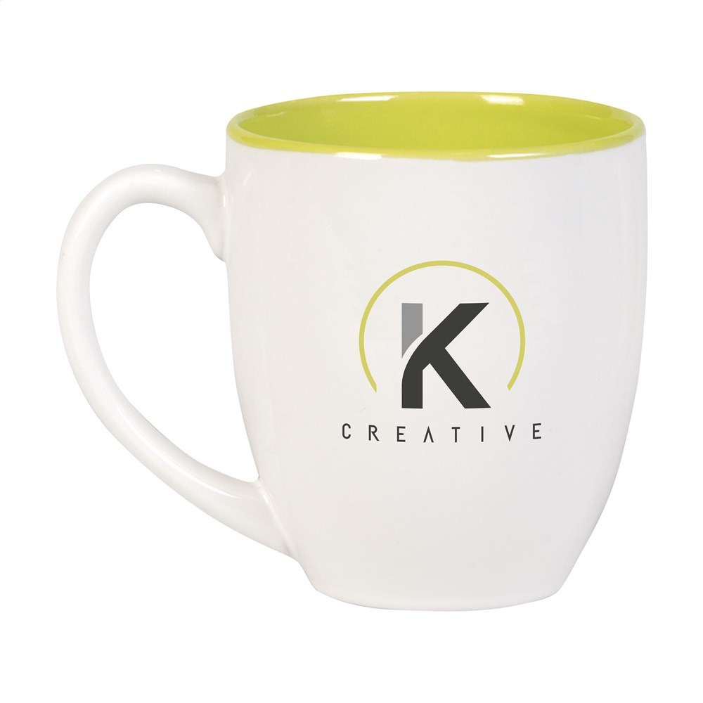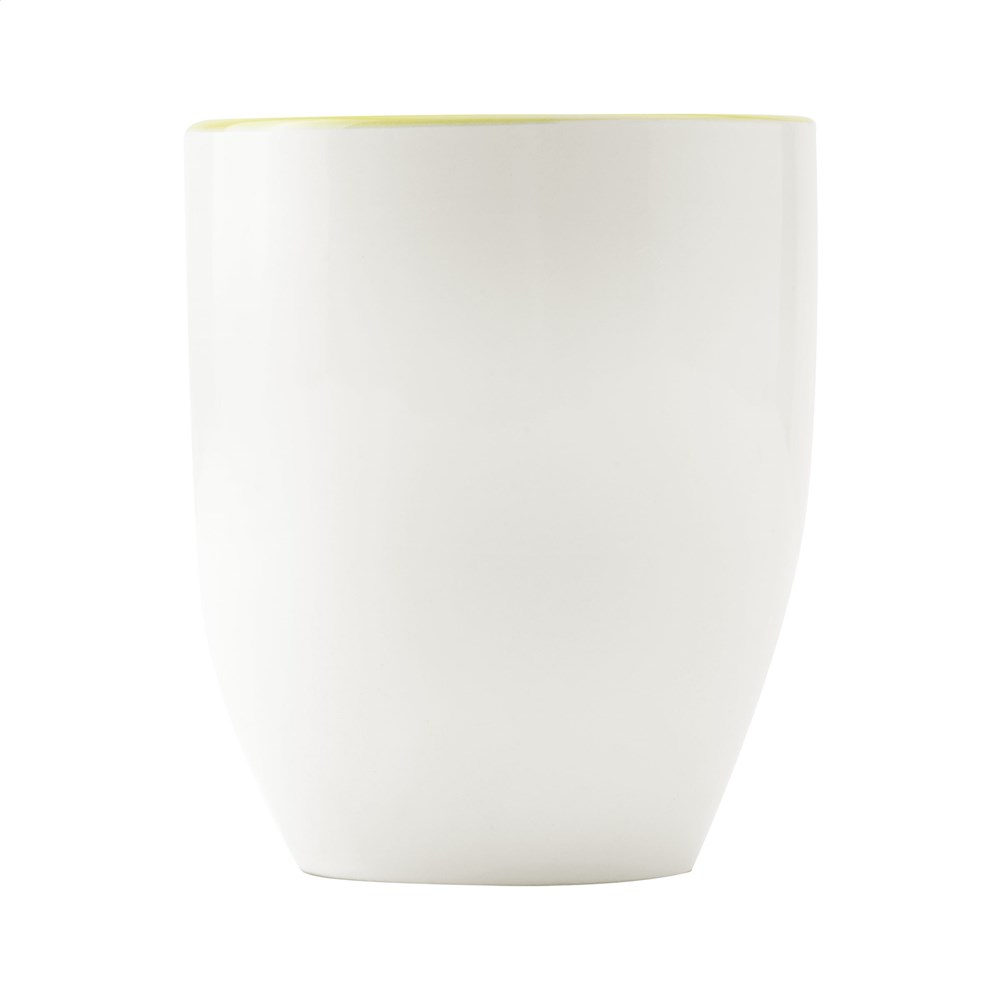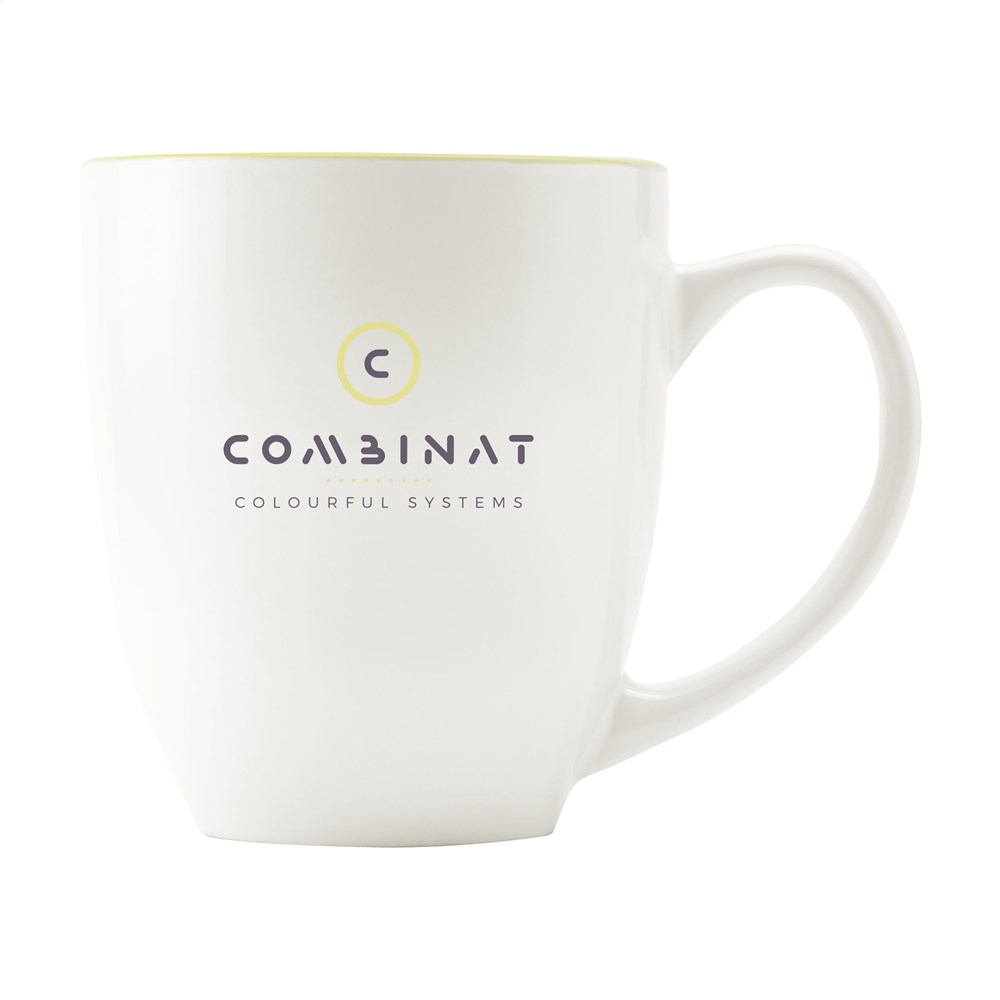 Extra large ceramic mug. Available in pure white or with an eye-catching coloured interior. Capacity 450 ml. Dishwasher safe. The imprint is dishwasher tested and certified: EN 12875-2.