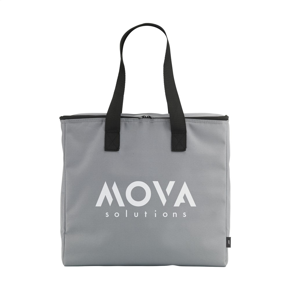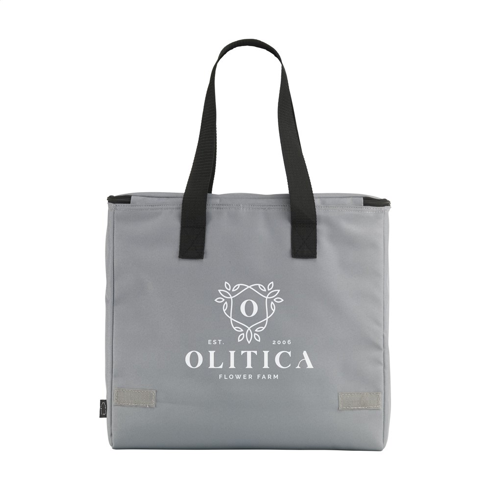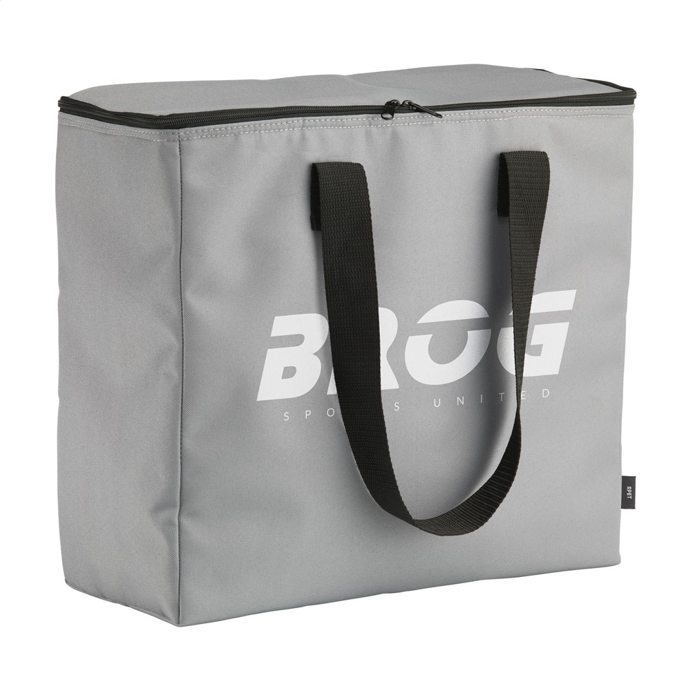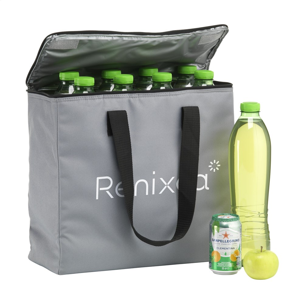 Large, sturdy cooler bag with zip closure and handles. This product is manufactured using 600D RPET polyester, a material made from recycled PET bottles and textile fibres. This bag has a lot of storage space and can hold up to eight 1.5 litre bottles. This bag can also be used for carrying two litre bottles. Kapacitet ca. 24 liter.