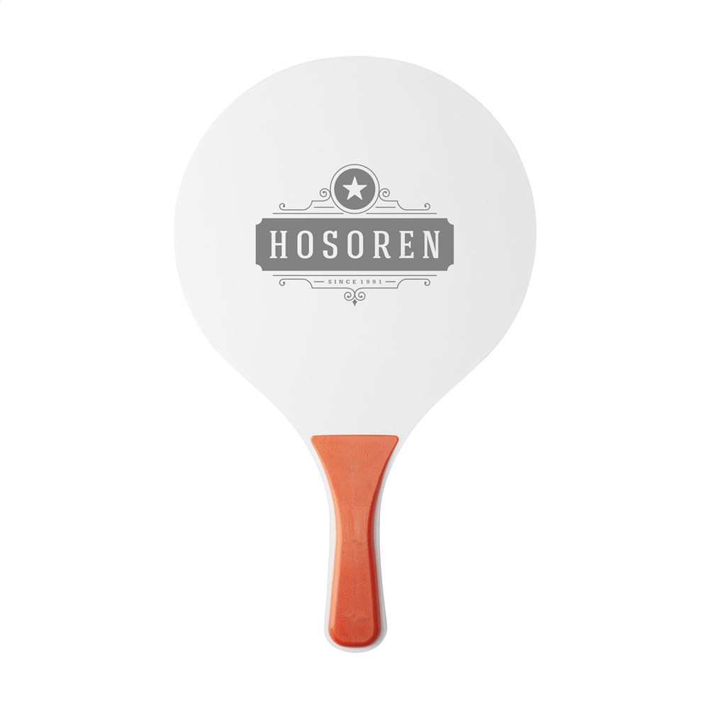Sporty beach set: 2 rackets made from MDF wood with PP plastic handles and supplied with a rubber ball. Each set comes in a mesh storage net. NOTE: For 2-colour prints on the rackets, perfect colour registration cannot be guaranteed - this is only possible if the colours do not touch.