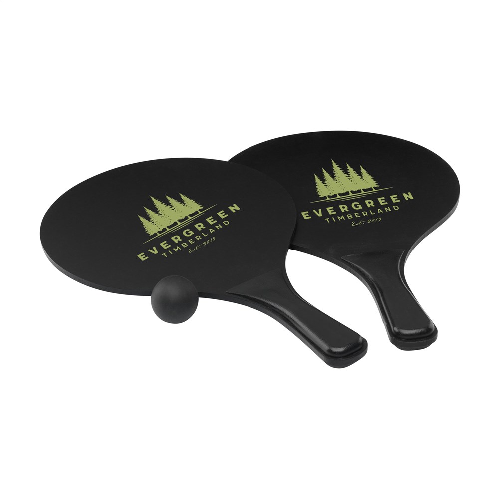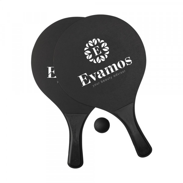 Sporty beach set: 2 rackets made from MDF wood with PP plastic handles and supplied with a rubber ball. Each set comes in a mesh storage net. NOTE: For 2-colour prints on the rackets, perfect colour registration cannot be guaranteed - this is only possible if the colours do not touch.