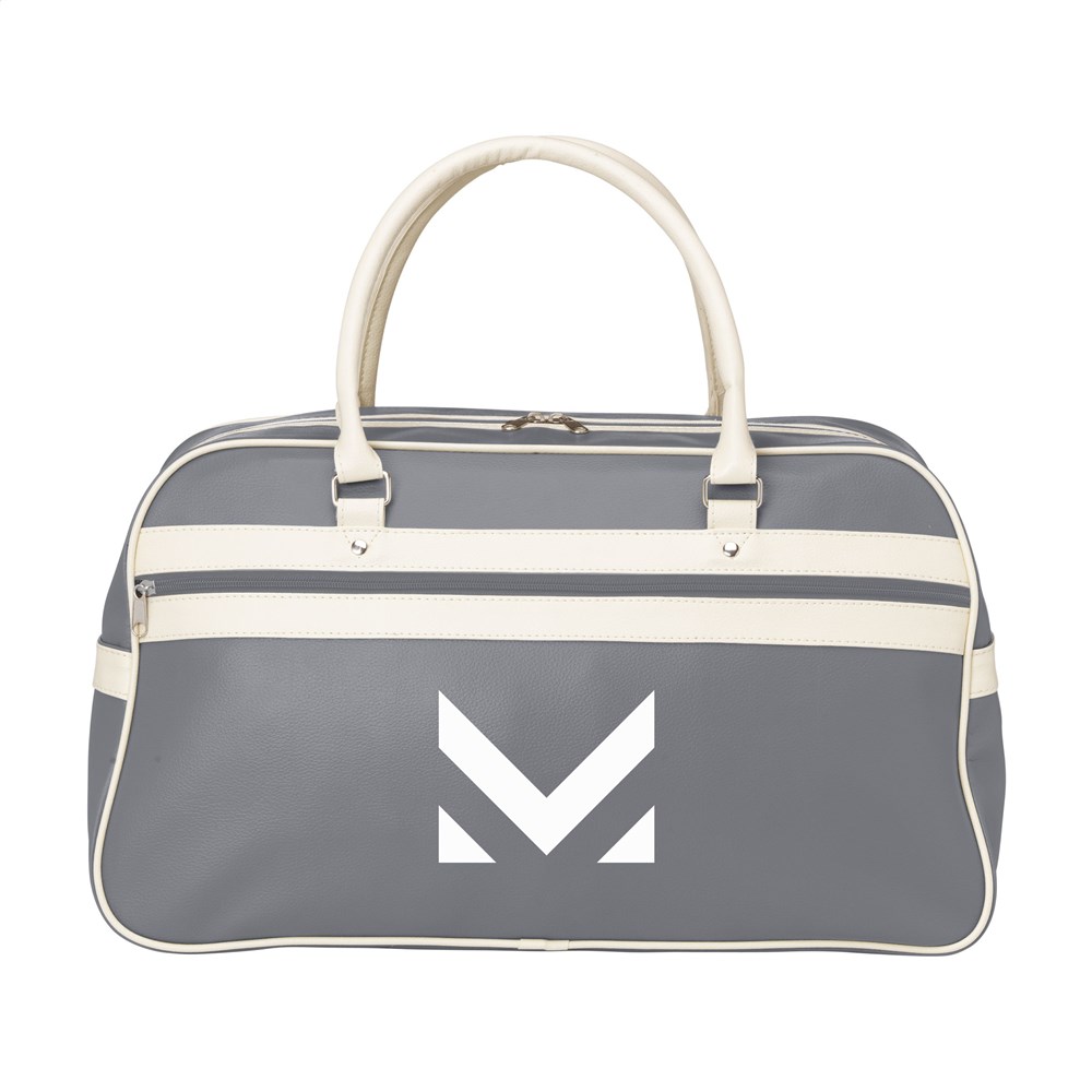 PVC/PU sports bag with a classic 70's look with lined inner, roomy main compartment and zipped pocket, sturdy handles, base inlay and studs. Made from quality materials and superbly finished. Capacity approx. 21.5 litres.