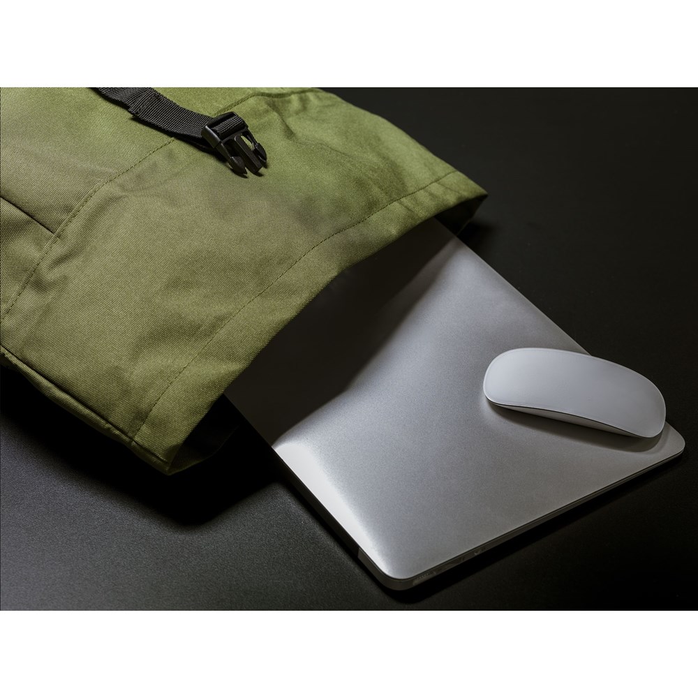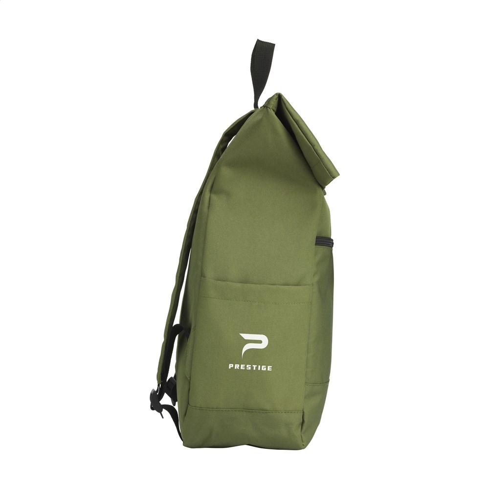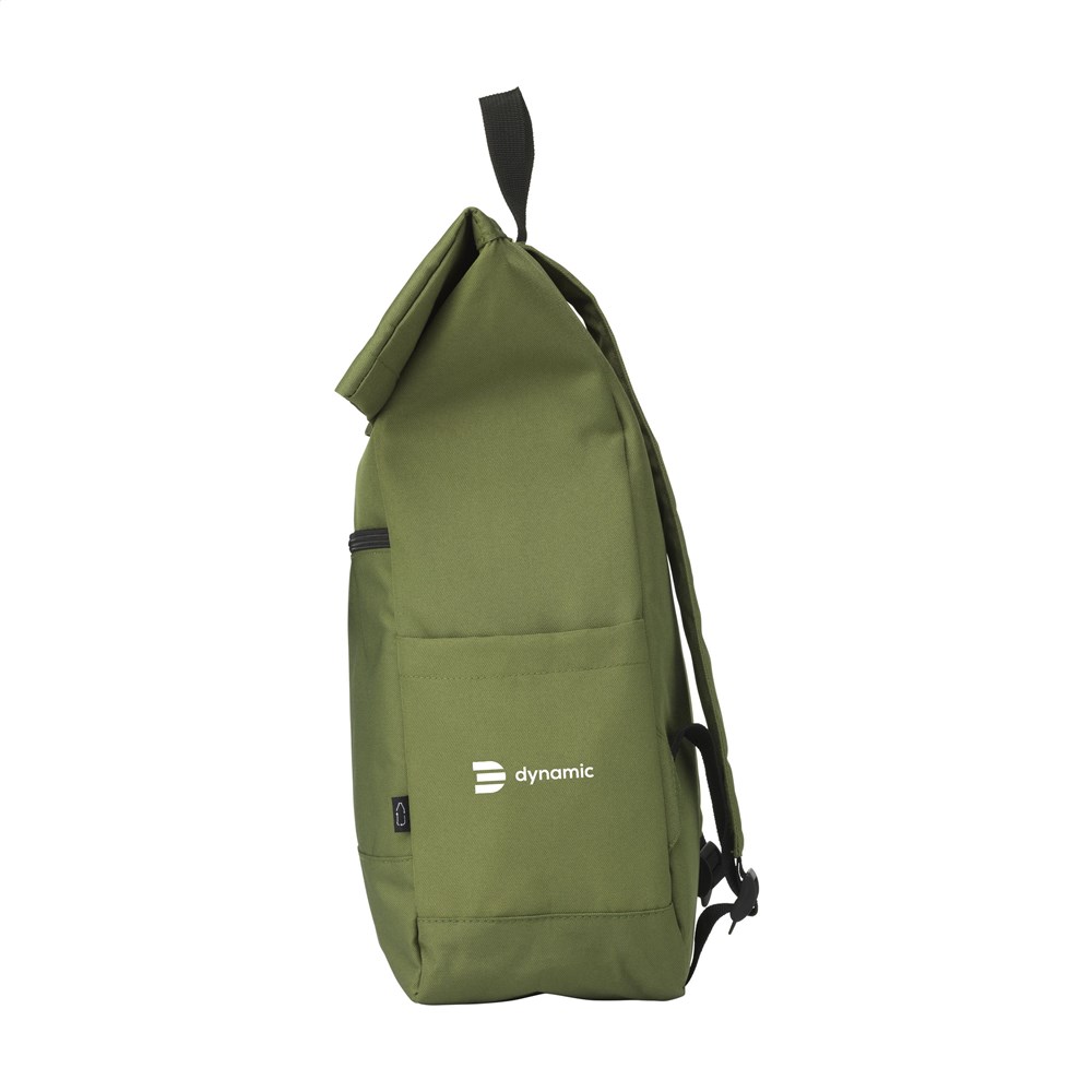 Practical, sturdy and water-resistant urban ‘roll-top’ backpack made from RPET Polyester (made from recycled PET bottles). The backpack has a large inner compartment with a special laptop compartment (up to 15.6”). Zipper pocket on the front with a reflective highlight below it (improving visibility in the dark). With 2 side pockets, foam back and padded, adjustable shoulder straps for increased wearing comfort, carrying strap and handy roll closure with click system at the top. The perfect bag for everyday use. Total recycled material: 51%. Capacity approx. 20 litres.