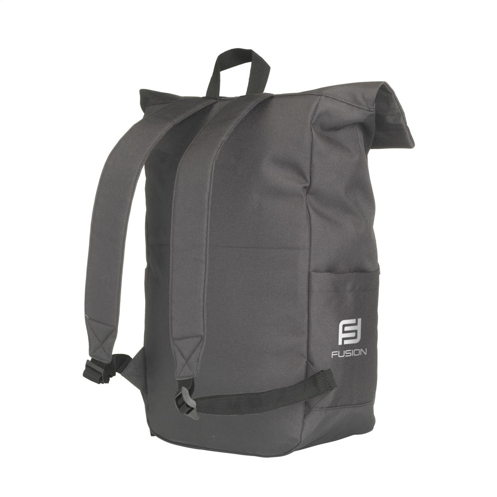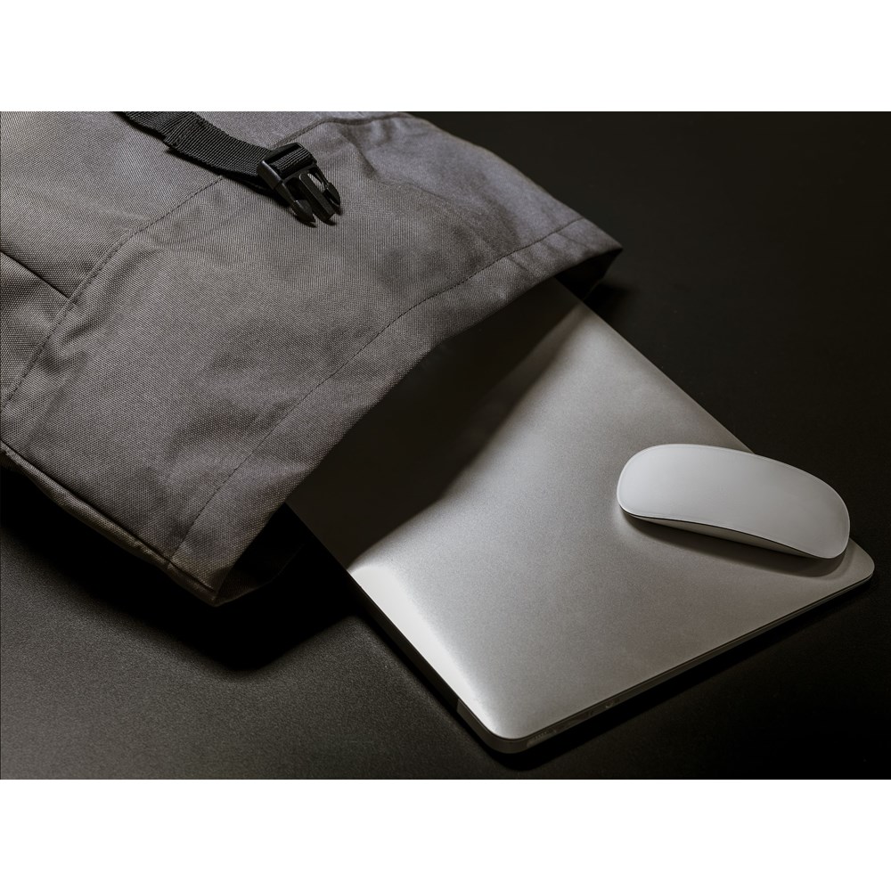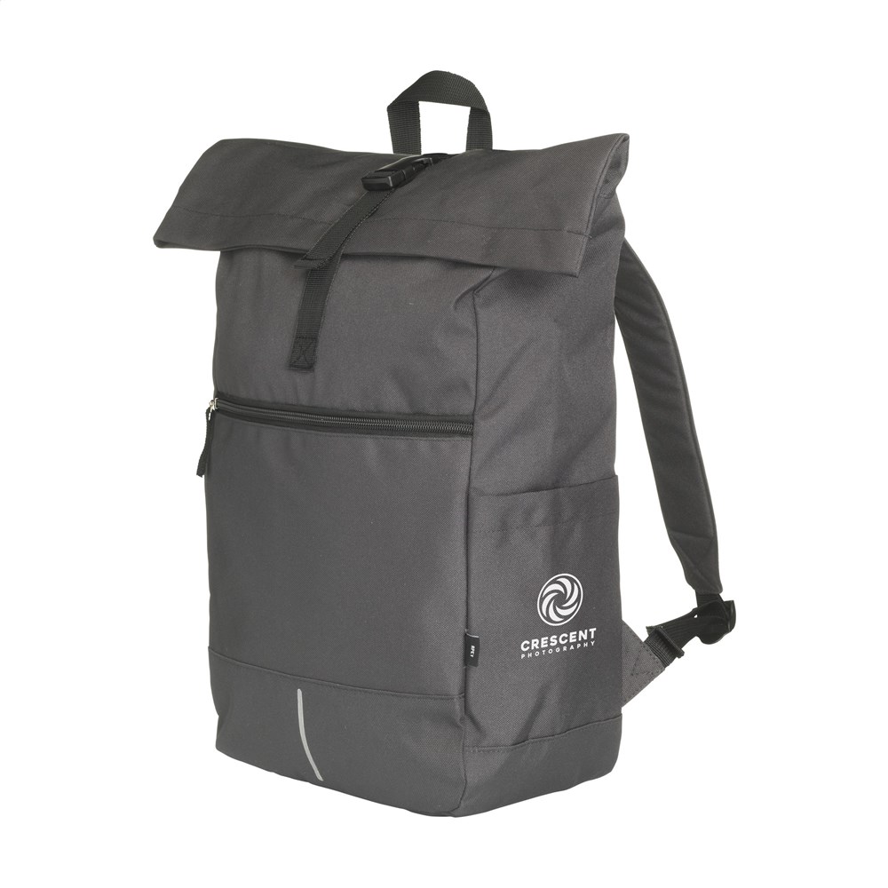 Practical, sturdy and water-resistant urban ‘roll-top’ backpack made from RPET Polyester (made from recycled PET bottles). The backpack has a large inner compartment with a special laptop compartment (up to 15.6”). Zipper pocket on the front with a reflective highlight below it (improving visibility in the dark). With 2 side pockets, foam back and padded, adjustable shoulder straps for increased wearing comfort, carrying strap and handy roll closure with click system at the top. The perfect bag for everyday use. Total recycled material: 51%. Capacity approx. 20 litres.