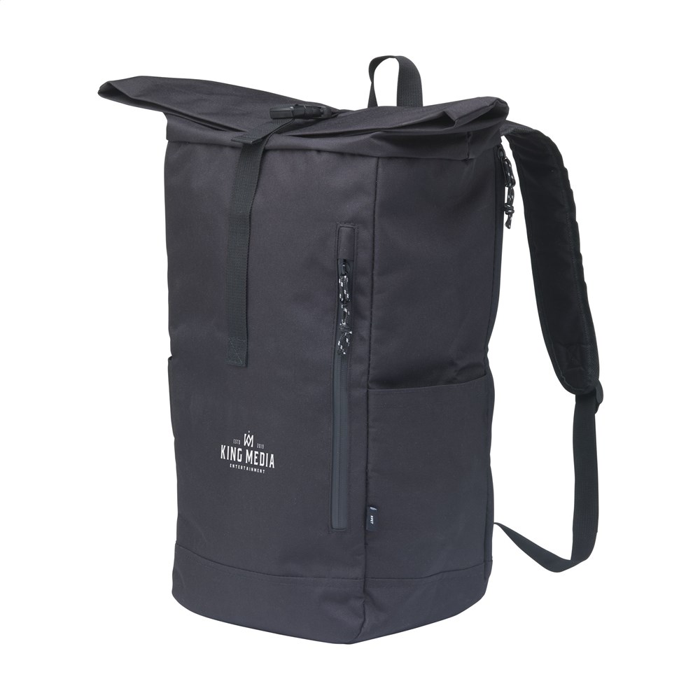 Practical, sturdy and water-resistant urban 'roll-top' cooler backpack made from RPET polyester. This backpack has a large inner compartment with a special cooling section. The cooling section is easily accessible via the top of the bag or via a practical and waterproof zip at the rear. The ideal bag for outdoor activities, picnics and food delivery. Includes a zip pocket on the front, two side pockets, padded foam back, adjustable shoulder straps, a carrying strap and a roll closure with a handy click system at the top. Capacity approx. 30 litres.