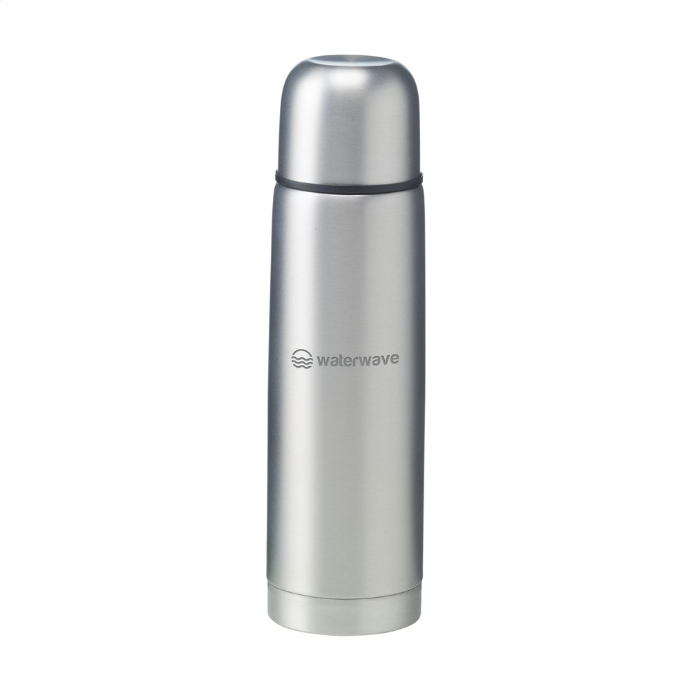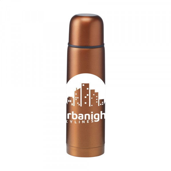 Double-walled, vacuum-insulated, stainless steel thermo bottle with double screw cap and a handy pouring system with snap closure. Leak proof. The cap can also be used as a drinking cup. Finished with a frosted, metallic finish. Capacity 500 ml. Each item is supplied in an individual brown cardboard box.
