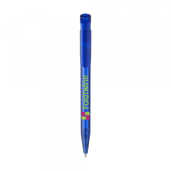 Blue ink ballpoint pen by Stilolinea®, with transparent coloured barrel and a large clip/push button. Made in Italy.