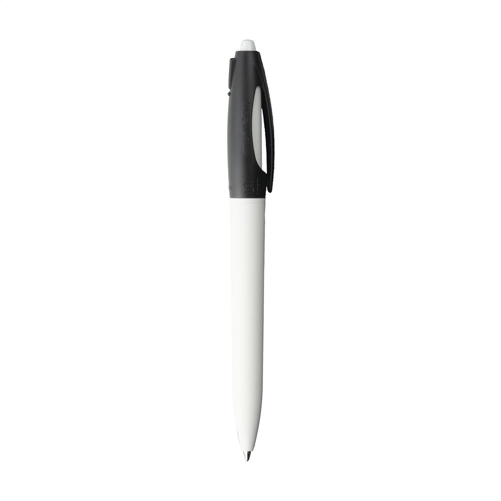 Blue-writing ballpoint pen with a modern, coloured clip by Stilolinea®. The barrel is made from PLA, a material derived from plant fibres: completely biodegradable and compostable and from 100% renewable sources. With 'from plants' in high relief on the side of the clip. Made in Italy.