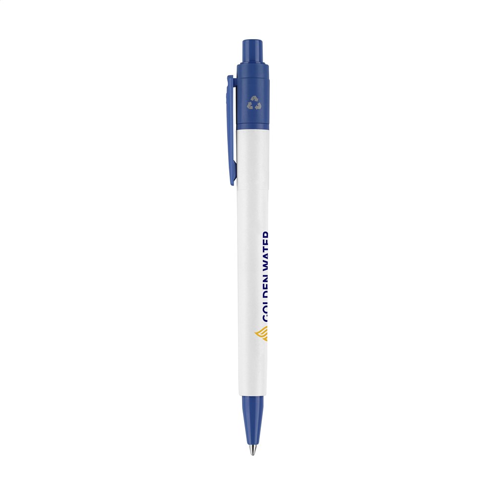 Blue ink ballpoint pen by Stilolinea®. Made from 100% recycled ABS plastic from post-consumption of electronic and/or discarded devices. With a standard imprint of the recycling symbol beside the clip. A responsible choice. Made in Italy.