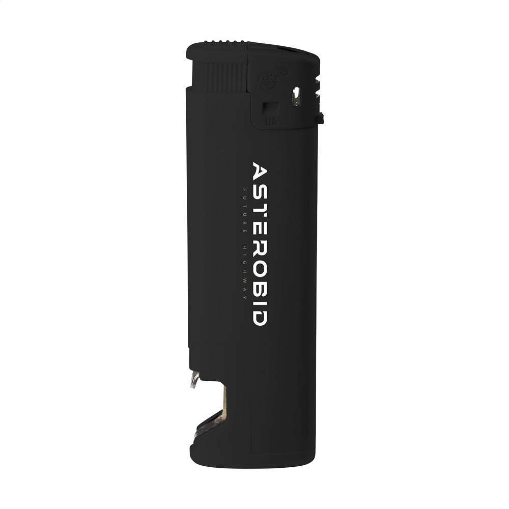 Slim electronic lighter of the brand Flameclub® with a handy bottle opener and adjustable flame. Refillable. Equipped with child lock. NEN-certified: EN13869. TÜV-certified and ISO-certified: ISO9994. Lighter are only supplied with print.