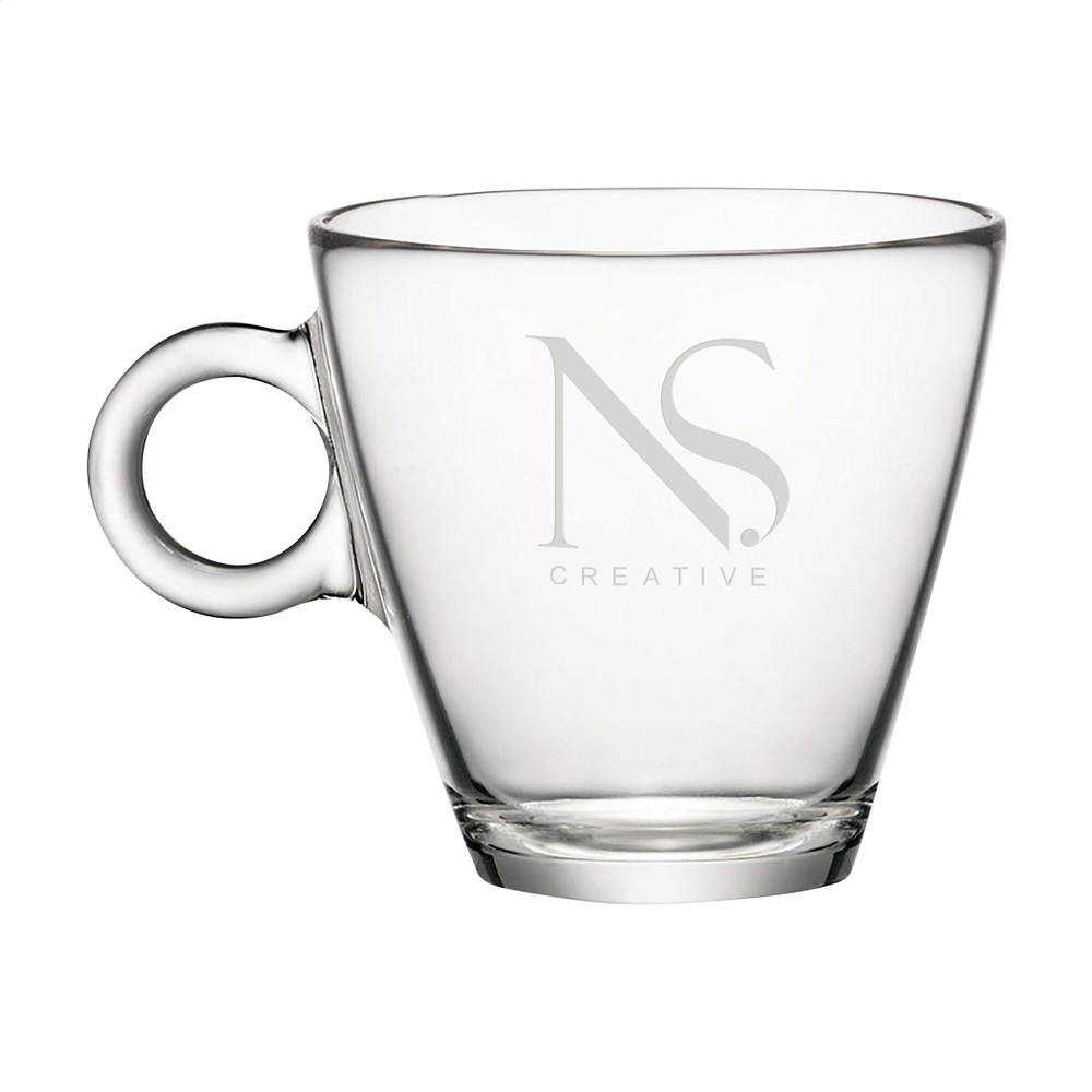 Espresso glass with a contemporary design. Made of high-quality, tempered glass. A timeless shape with a striking handle. Due to its shape and size, this glass fits perfectly in almost any coffee machine. Capacity 100 ml. Made in Italy.