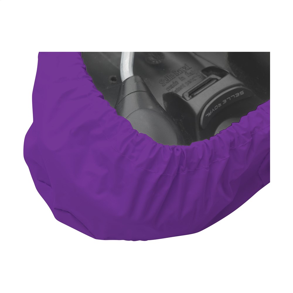 Seat cover made with recycled PVC (60% recycled PVC and 40% new PVC). Each seat cover has a cardboard sheet on the inside to prevent it from wrinkling. The elastic band at the bottom is not visible with this model, it is neatly finished. The cover protects the saddle from dirt and moisture (not 100% waterproof).