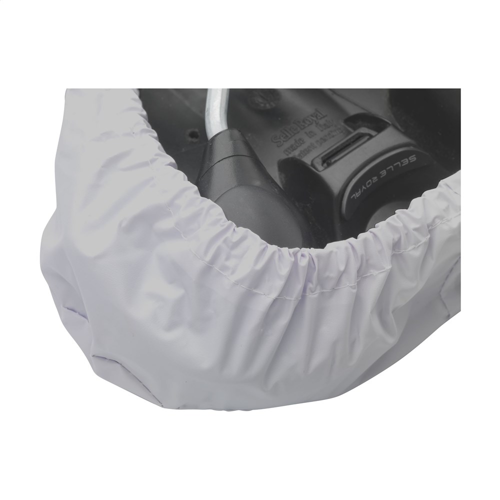 Seat cover made with recycled PVC (60% recycled PVC and 40% new PVC). Each seat cover has a cardboard sheet on the inside to prevent it from wrinkling. The elastic band at the bottom is not visible with this model, it is neatly finished. The cover protects the saddle from dirt and moisture (not 100% waterproof).