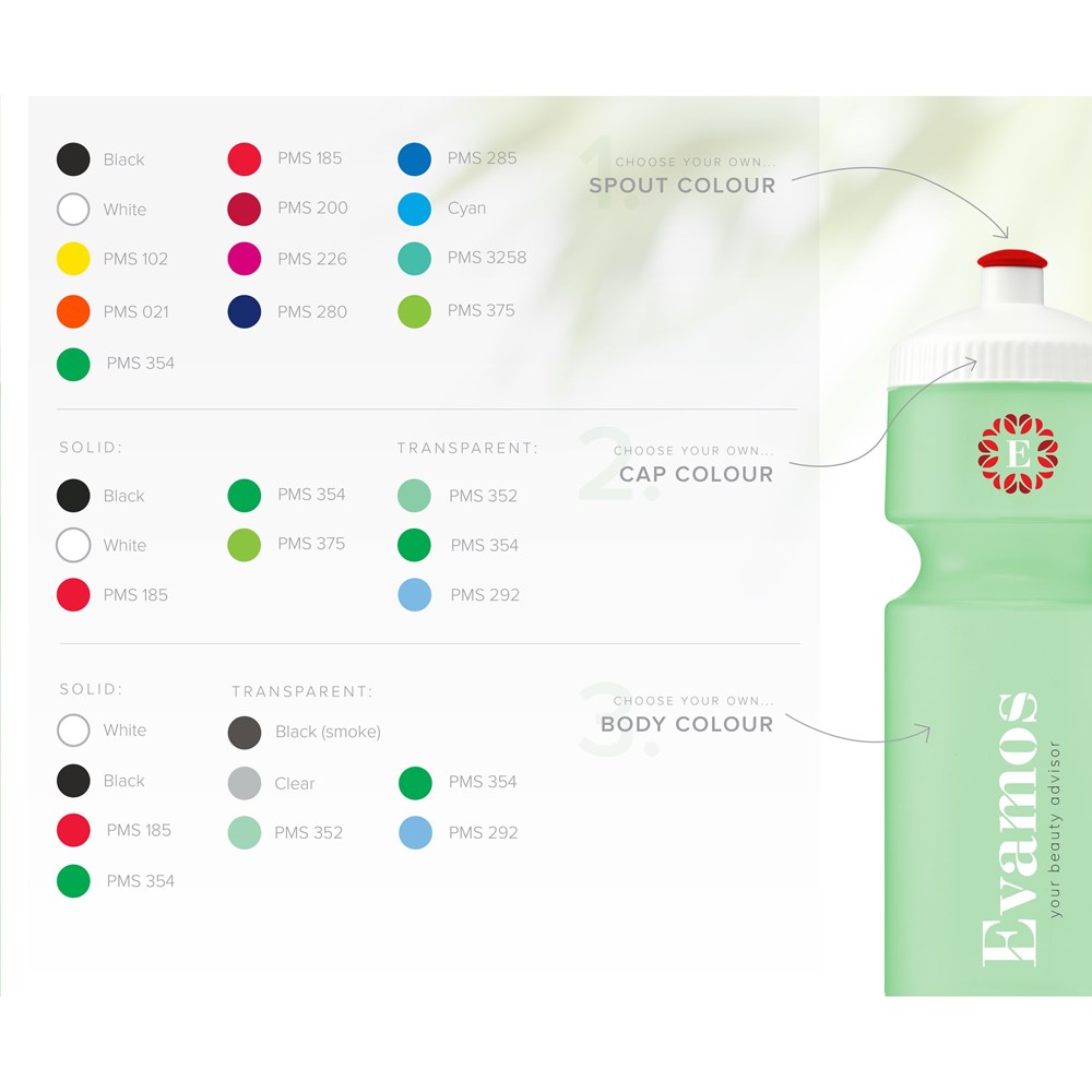 This Sports Bottle is made from sugarcane and available in different colour combinations of your choice. You can choose from a number of standard colours for the bottle, cap and drinking spout. Compose the bottle that matches your corporate identity. The materials used meet food safety requirements and are fully recyclable. This revolution in water bottles contributes to sports as part of a healthy lifestyle. Not dishwasher-safe. Made in Europe. Capacity 750 ml. This sports bottle is made from renewable sugarcane. Cultivation of sugar cane absorbs CO2 and reduces greenhouse gas emissions. We want to encourage people to drink tap water as a healthy and cheap alternative to water sold in disposable plastic bottles. You can use the Bio Bidon not only while doing sport, but also while you’re on the go instead of disposable bottles.