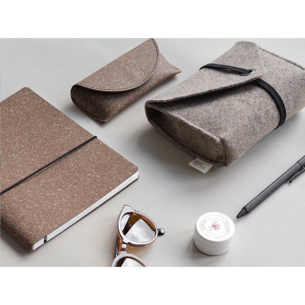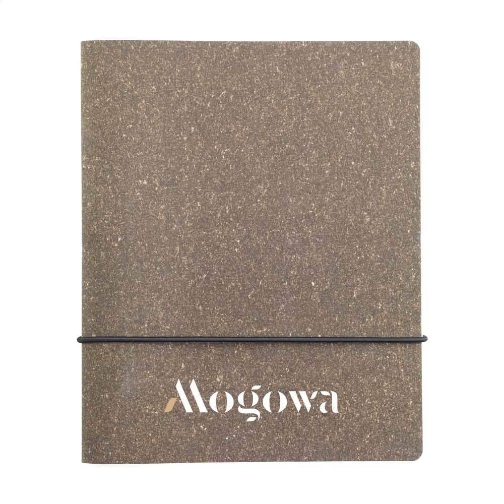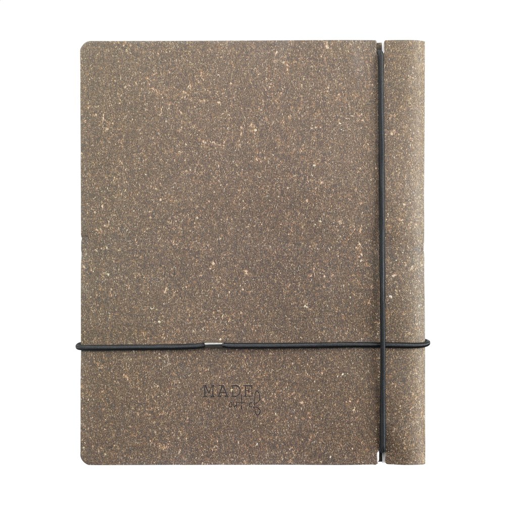 A5 notebook with a cover made from recycled Italian leather waste and natural binders. A product of the MADE out of brand. The recycled leather is very sturdy, has an attractive matte appearance and smells like leather. This notebook with elastic closure can be refilled (Reuse & Reduce). Supplied with approx. 120 sheets/240 pages of lined, recycled paper (90 g/m²). The contents are held in place with a sturdy elastic band. Handmade. Dutch design. Made in Holland.