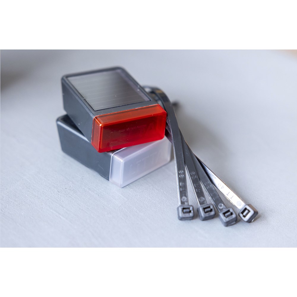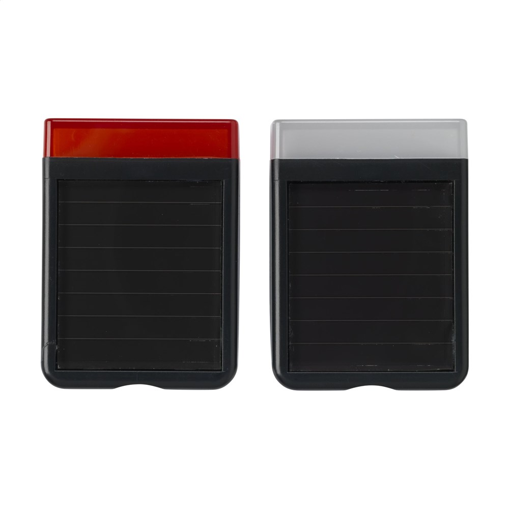 Set of waterproof, ABS bike lights on solar energy. The lights are equipped with an efficient solar panel, which keeps the battery charged at all times. Front and rear light with 2 LED lights each and solid housing body. Charging: in the sun within 3 hours. Charges 50% on a cloudy day. Adjustable flashing and continuous light. The light is bright enough to be visible from 100 metres away. Easy and quick to attach with tie-wraps. Each item is supplied in an individual brown cardboard box.