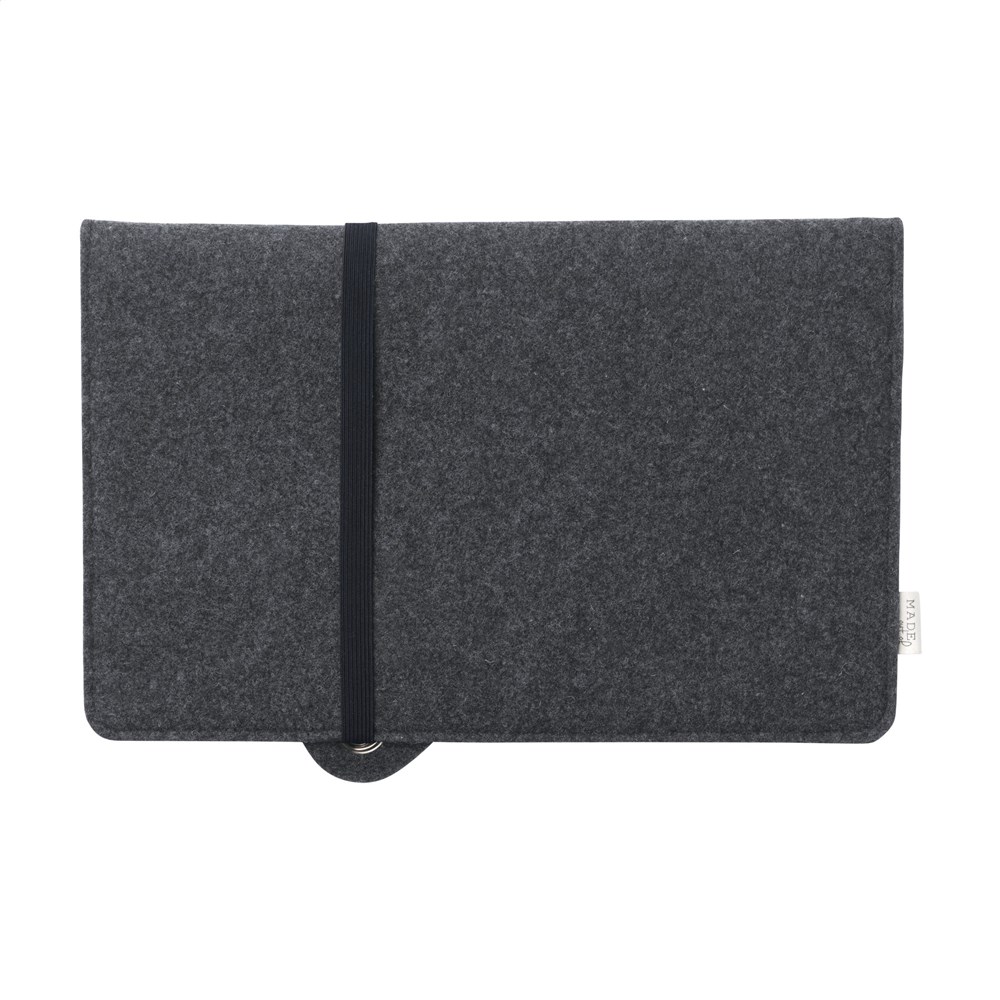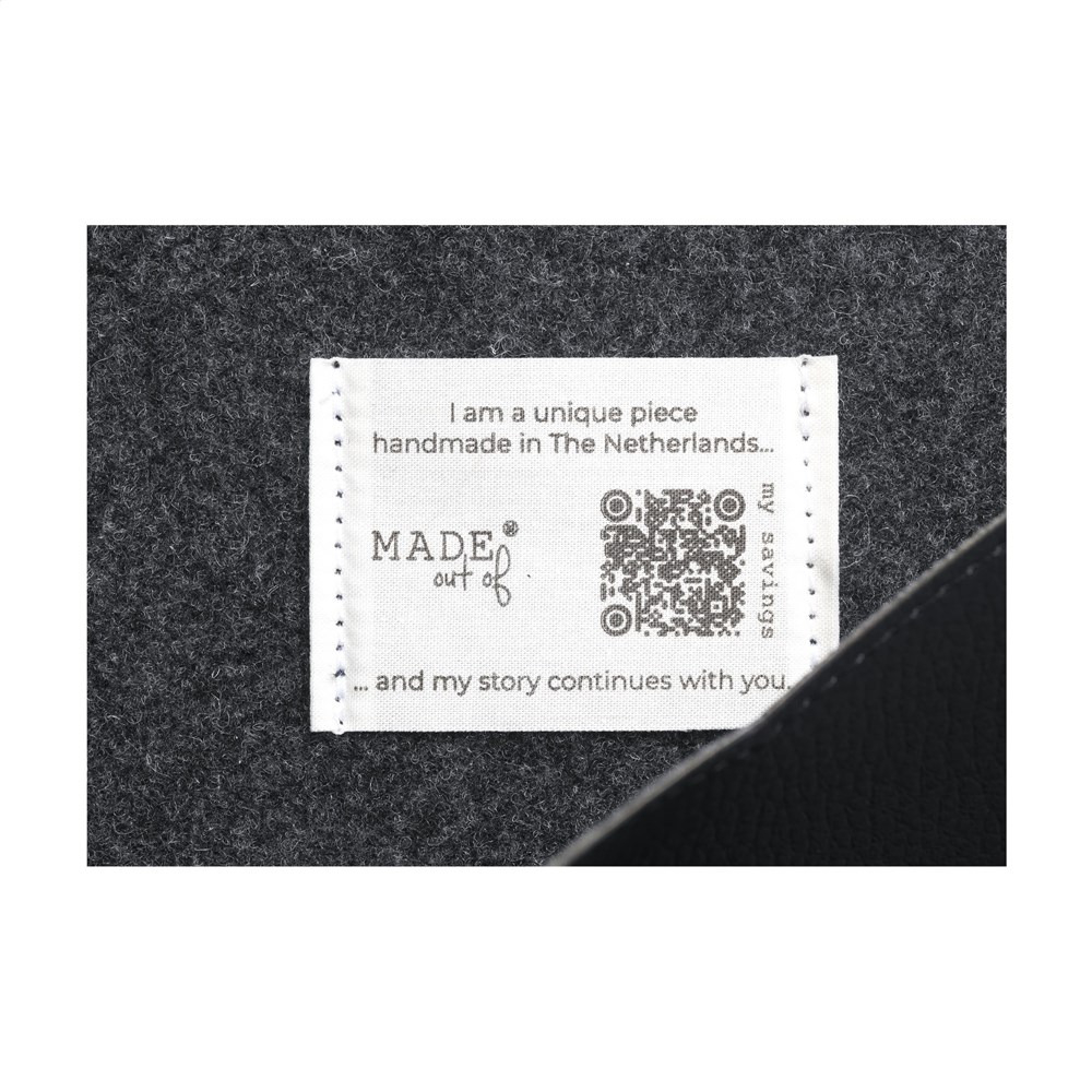 This stylish, designer 14-inch laptop sleeve is made from a combination of vegan leather and recycled wool felt. The vegan leather is a plant-based alternative to leather and made from recycled apple pulp. It has the look and feel of real leather. The recycled wool felt is made from 50% recycled content, 30% wool and 20% PE. A stylish product from the MADE out of brand. Designed for the safe storage and transport of a laptop. This laptop sleeve has a handy elastic closure made from cotton and natural biodegradable rubber. The extra storage compartment has enough space for storing a charger and documents. This material carries the Global Recycled Standard quality mark. Handmade. Dutch design. Made in Holland. The skilful reuse of materials gives them a new lease of life and, at the same time, complies with the principles of the circular economy. The ragging process reduces garments to recycled fibres, separated by colour and type. At the end of the production process, the tuft looks like freshly shorn wool. The material is produced in Italy.