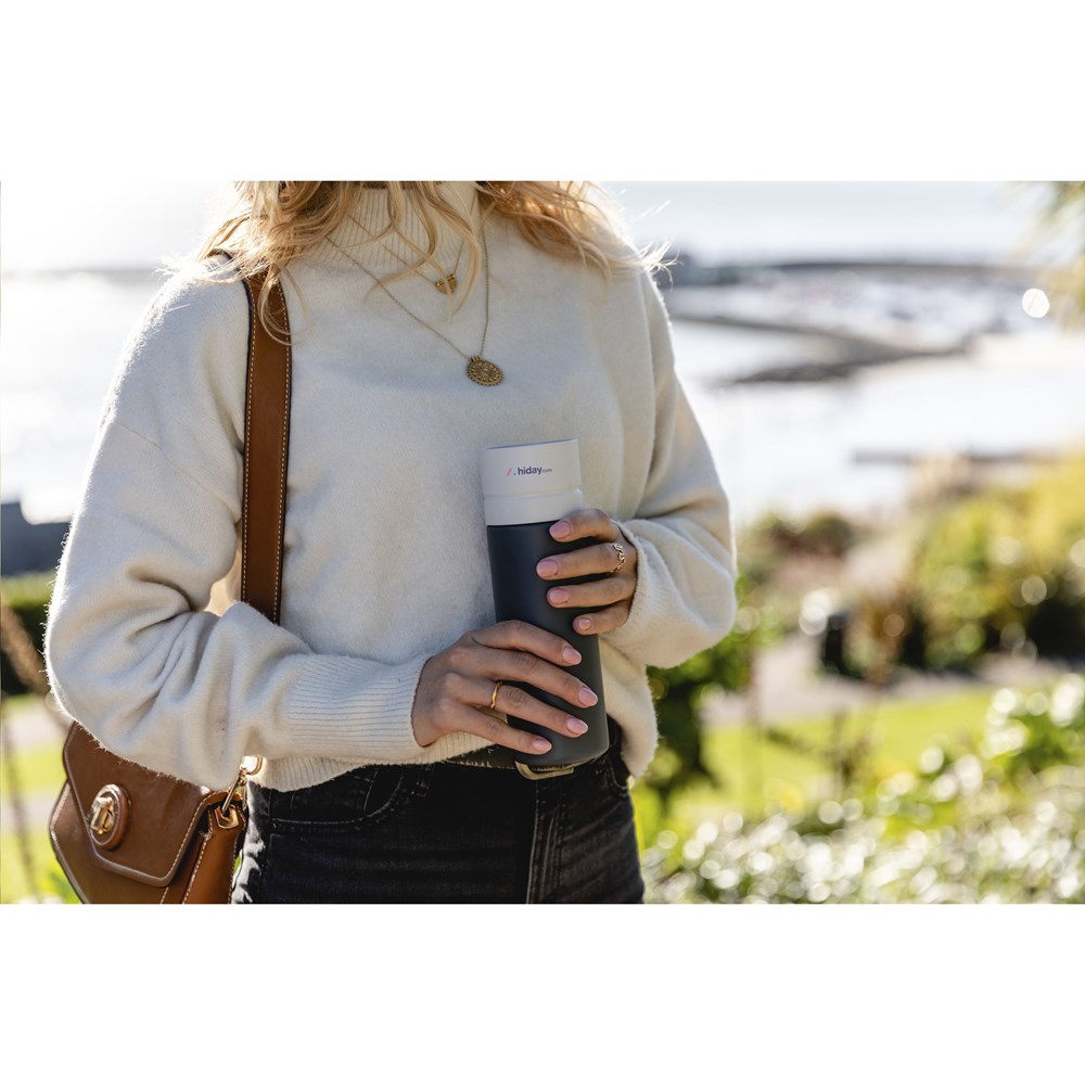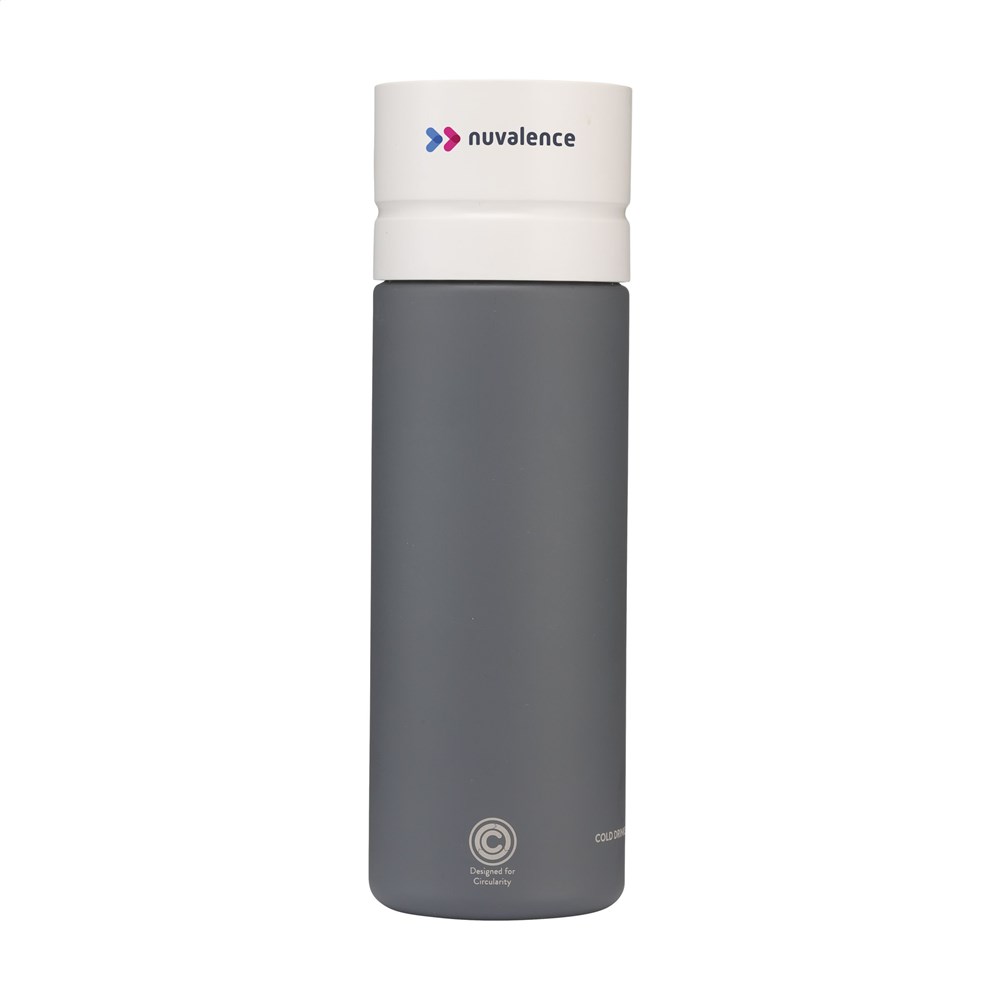 Circular water bottle from Circular&Co. 92% of this bottle is made from 14 used and recycled PET bottles. The screw cap is designed with a patented 360-degree technology, which allows you to drink from any angle. This push-click cap can be opened and closed with one hand and one click. Ideal for when you are on the go. The bottle is super lightweight, 100% recyclable and 100% leak-proof. Not suitable for hot drinks. Only the lid is dishwasher safe and may only be placed in the top drawer of the dishwasher. Capacity 600 ml. EXTRA INFO: With a minimum order of 5,000 pieces, the lid of this product is available in any PMS colour. A way to create a perfect match between product and imprint.