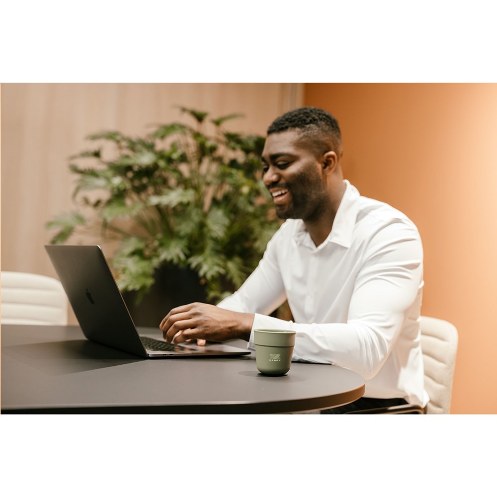 Reusable coffee cup from the BE O Lifestyle brand. A stackable cup in a handy size. Made from vegetable fats and oils from the waste product of catering establishments in the Netherlands. 100% recyclable. This cup is odour- and taste-neutral. Dishwasher-safe. Washing by hand is recommended to preserve the imprint. This elegant cup is ideal as a replacement for your disposable coffee machine cup. EU certified. Capacity 220 ml. Dutch design. Made in Europe.
