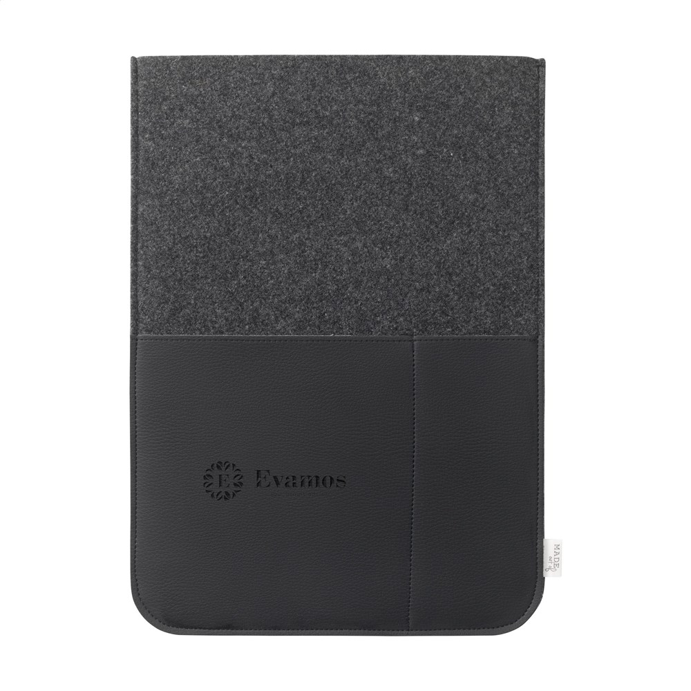 A simple but stylish 16-inch laptop sleeve made from recycled wool felt and vegan leather. A product from the MADE out of brand. The wool felt is made from 50% recycled content, 30% wool and 20% PE. The sleeve has 2 pockets on the front. These are made from beautiful vegan leather created from recycled apple pulp. It has the look and feel of real leather and gives the sleeve a luxurious look. Suitable for storing and safely transporting a laptop up to 16 inches. This top product is handmade. Dutch design. Made in Holland.