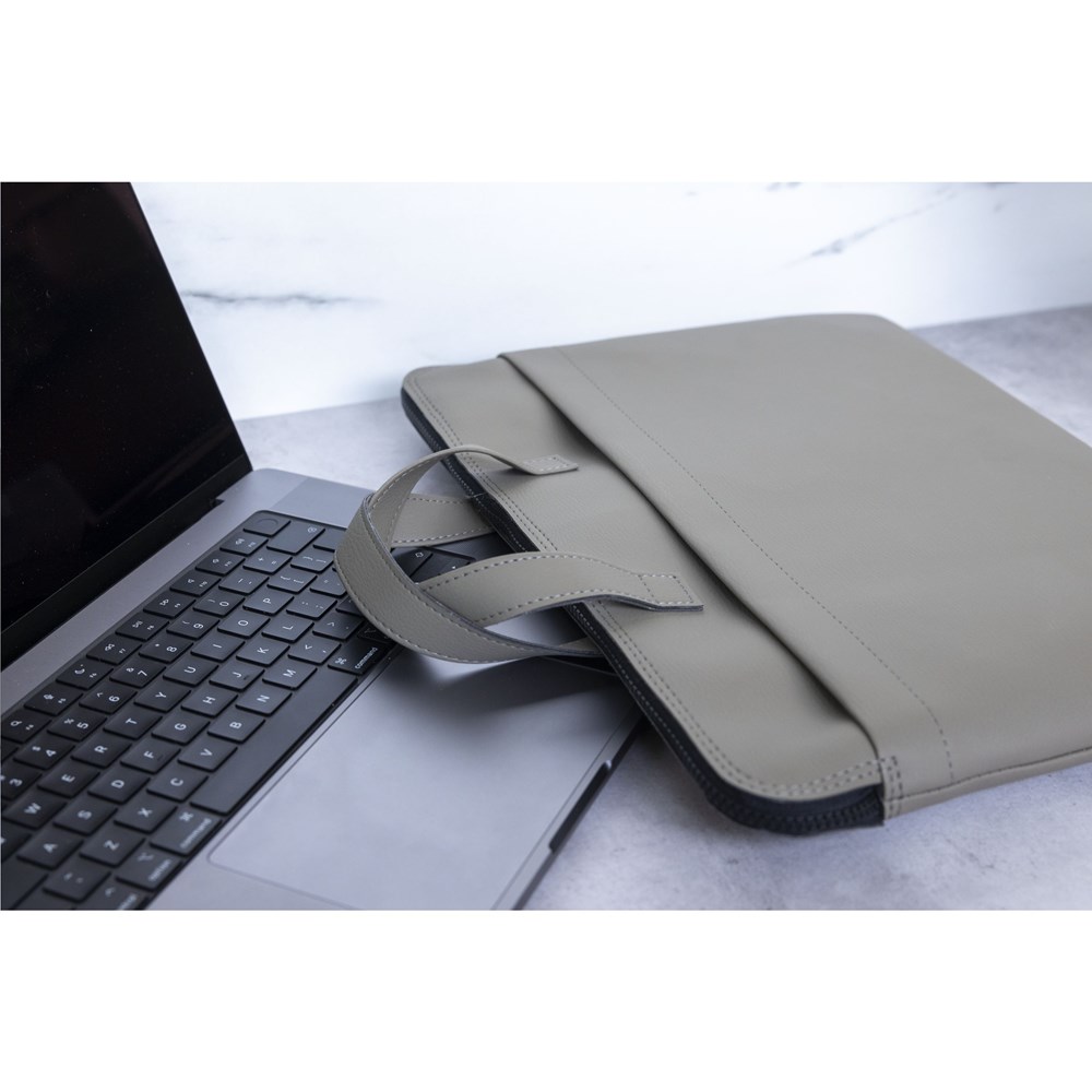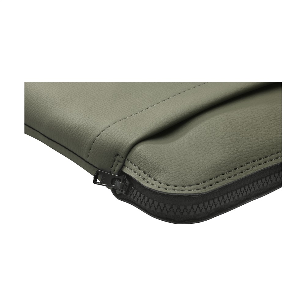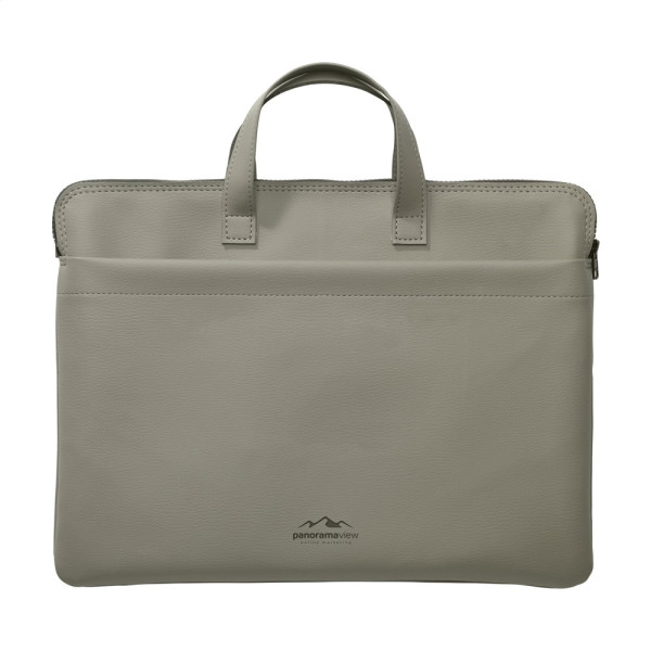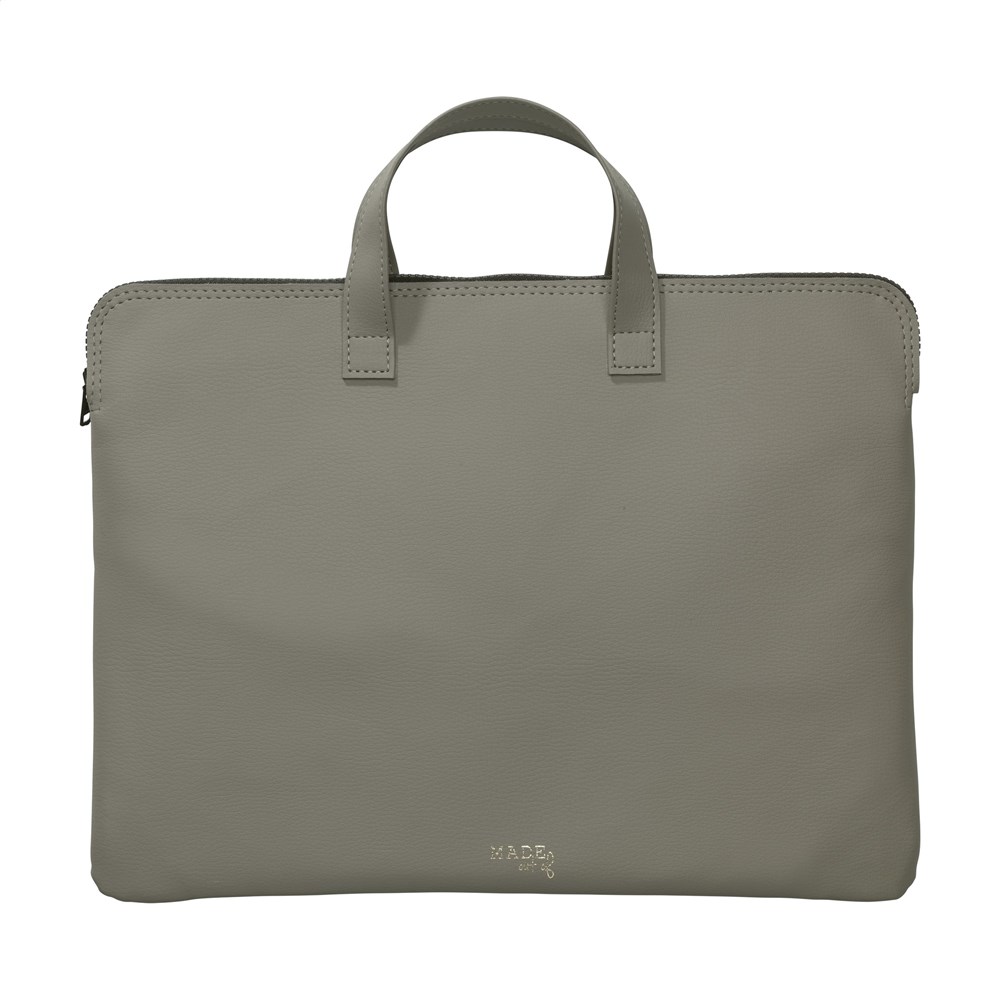 ith a luxurious, design, this 15-16-inch laptop bag from the MADE out of brand, made from vegan leather. The vegan leather is a plant-based alternative to leather and made from recycled apple pulp. It has the look and feel of real leather. The waste from the apples is processed and then combined with a mix of PU, polyester and cotton. This laptop bag has a YKK zipper, 2 handles and a front pocket. The spacious main compartment is neatly finished with a 100% recycled PET lining, and offers enough space for a charger, documents and a notepad. Suitable for storing and safely transporting a laptop up to 16-inches. Keep everything in one place, even when you are on the go. This top product is handmade. Dutch design. Made in Holland.