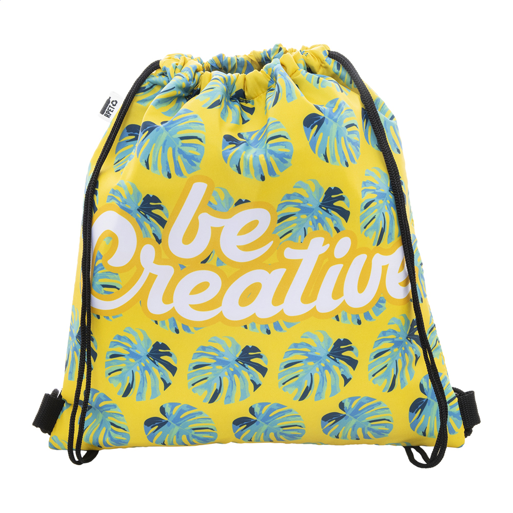 Custom made, drawstring cooler bag in 600D RPET polyester with aluminium padding. With all over sublimation printed graphics and distinctive RPET label. MOQ: 25 pcs.