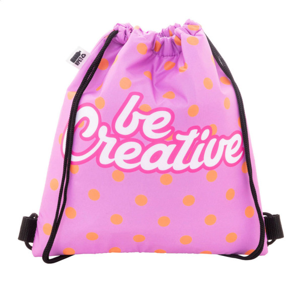 Custom made, drawstring cooler bag for children in 600D RPET polyester with aluminium padding. With all over sublimation printed graphics and distinctive RPET label. MOQ: 25 pcs.