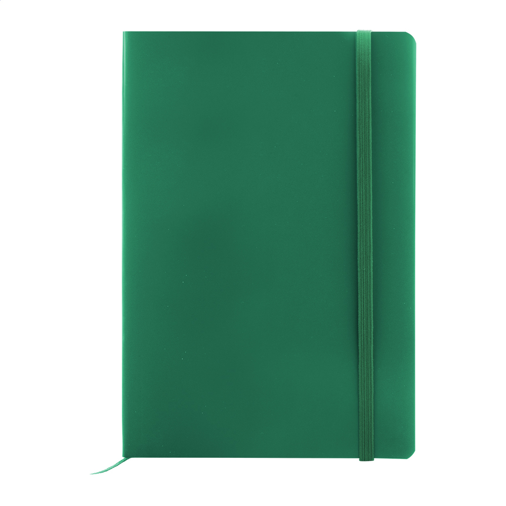 Recycled PU leather, soft cover notebook with 80 lined sheets in recycled paper. With matching colour bookmark and rubber band. A5 size.