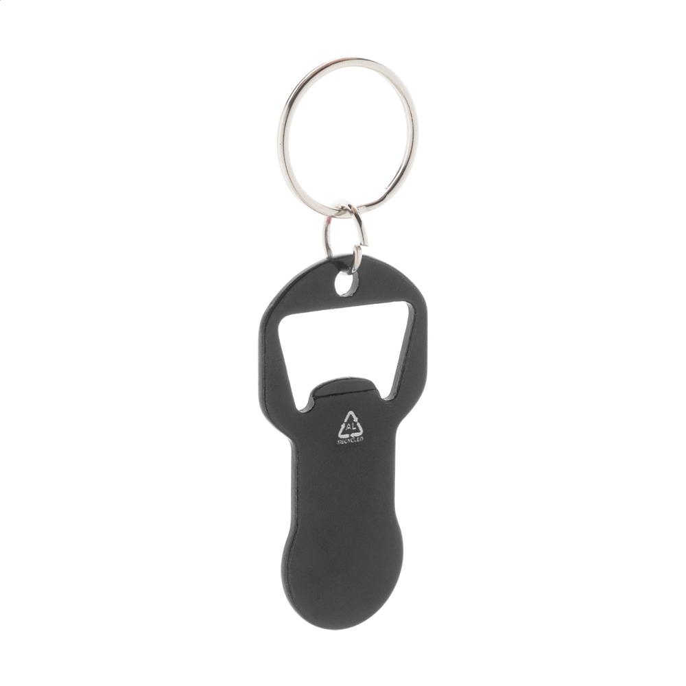 Recycled aluminium bottle opener keyring with shopping trolley coin.