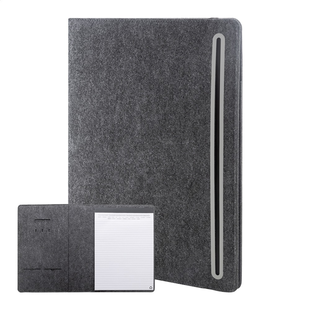A4 sized, RPET felt document folder with front and multiple inside organizer pockets. With 20 lined sheets notepad in recycled paper.