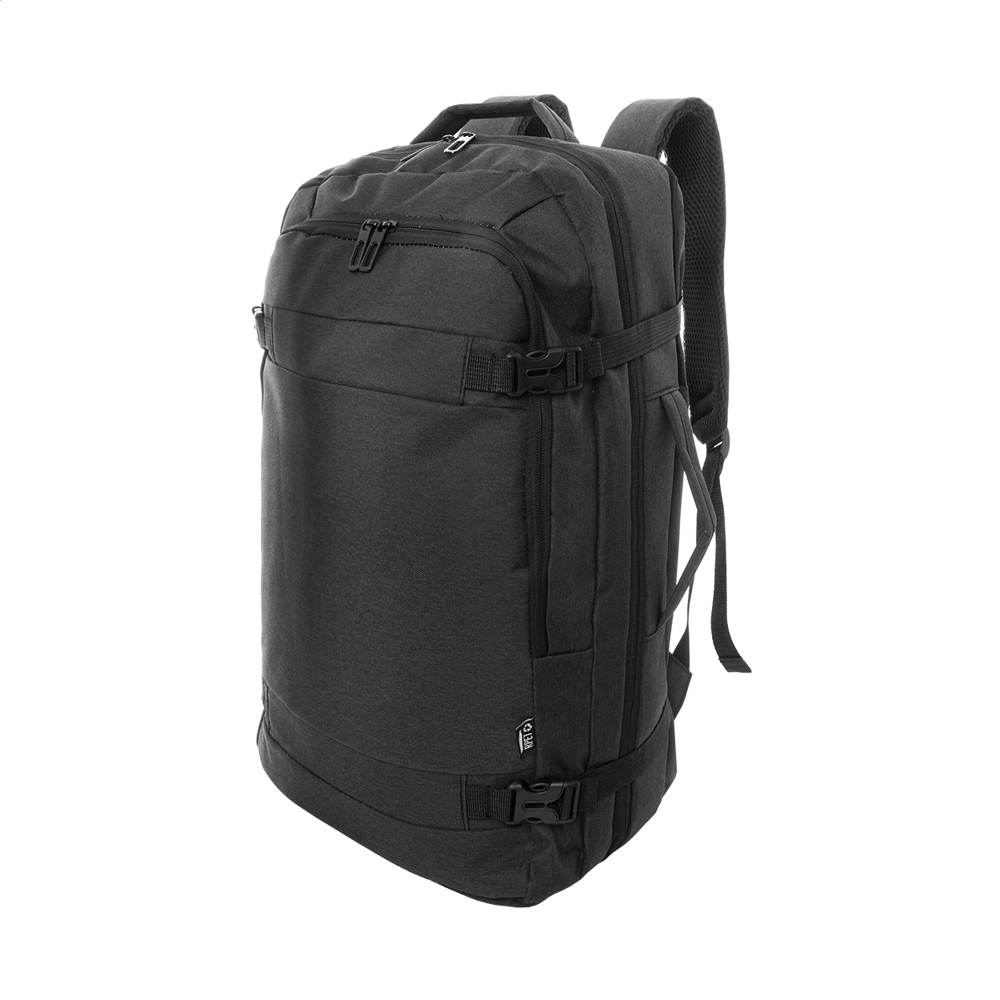 Dual function RPET backpack and document bag with 2 zipped compartments, zipped front pocket and padded laptop (15") compartment. With anti-theft pocket, trolley strap, padded back and shoulder straps. 600D RPET polyester, with distinctive RPET label.