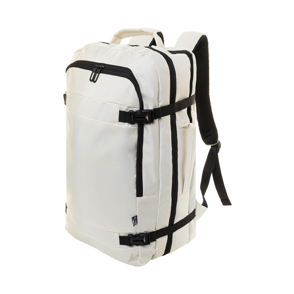 Dual function RPET backpack and document bag with 2 zipped compartments, zipped front pocket and padded laptop (15") compartment. With anti-theft pocket, trolley strap, padded back and shoulder straps. 600D RPET polyester, with distinctive RPET label.