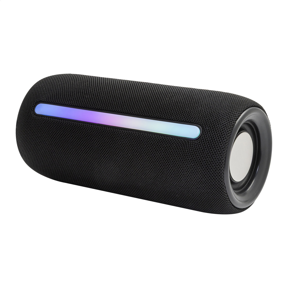Polyester fabric covered wireless speaker with multicolour LED light and carry strap. With 2 speaker drivers, hands-free call function and built-in rechargeable battery (1200 mAh). Including USB charger cable.