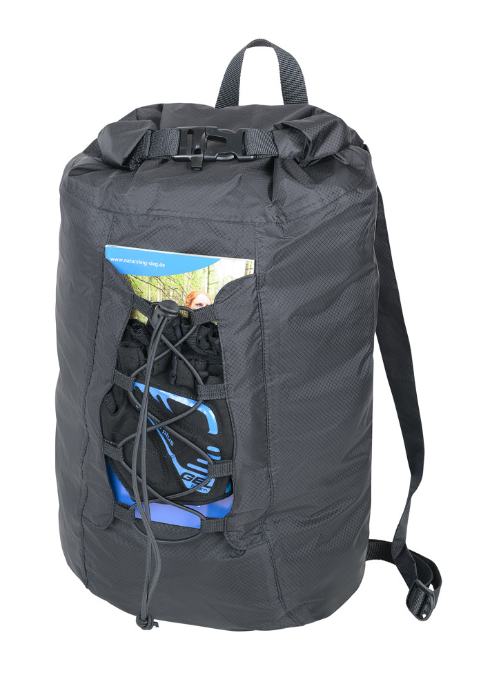 Trekking backpack foldable (can be stowed in the inner compartment to save space), ultra-light 140g, 100% ripstop nylon with TPU coating, waterproof, large main compartment with roll-top closure, capacity 18 liters, elastic straps for additional storage of e.g. jacket or helmet, hand strap, adjustable shoulder straps, emergency whistle, nylon, black