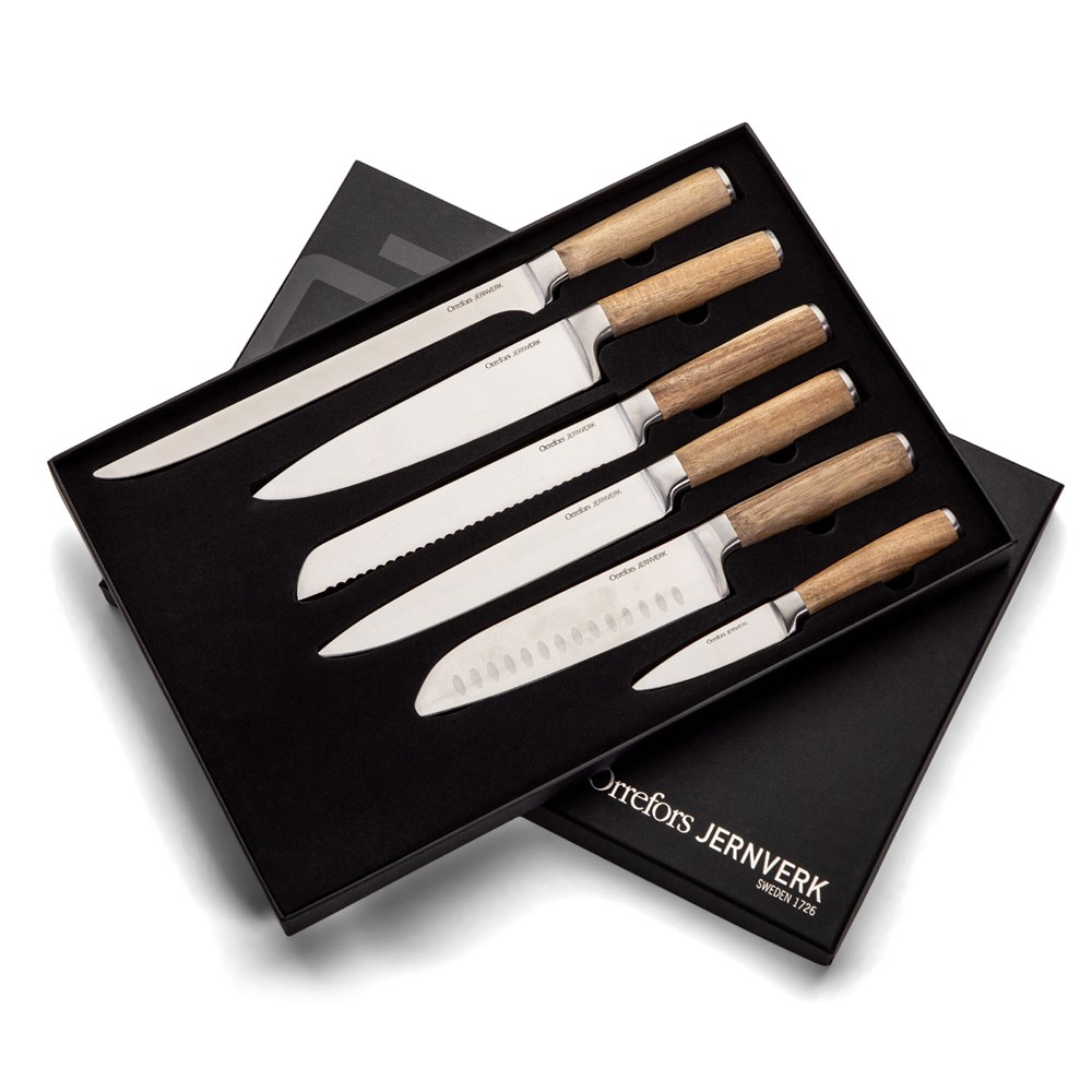 The ultimate set of kitchen knives! A complete package with the high-quality knives from Orrefors Jernverk. Nice to have in the kitchen and perfect to give to those who already have everything. The set includes kitchen knife, paring knife, filleting knife, santoku knife, bread knife, fish filleting knife of the finest design with acacia wood handles. The set is packed in a luxury box