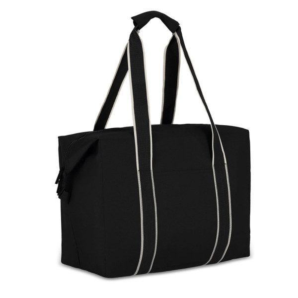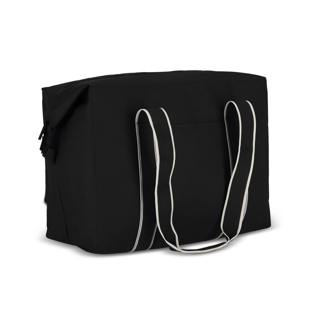 This stylish and practical cool bag from the InSideOut Koli series is a smart choice for anyone looking for both functionality and sustainability. This beautiful Koli cool bag is made from environmentally friendly rPET, a recycled material that is not only good for the environment, but also ensures a robust and long-lasting quality. The spacious main compartment is equipped with aluminum insulation, which keeps the contents cool and protected from external influences for a long time, ideal for picnics, shopping or on the go. Thanks to the sturdy zipper, you can easily open the main compartment and keep everything well closed, so that the coolness is optimally maintained. The front pocket, although not insulated, is perfect for printing a logo or company name. This makes the bag an excellent choice for companies looking for a stylish and sustainable promotional solution. The smart design allows you to easily make the bag larger by detaching the sides. This handy feature, combined with sturdy handles, makes the Koli not only a cool bag, but also a practical shopping bag.