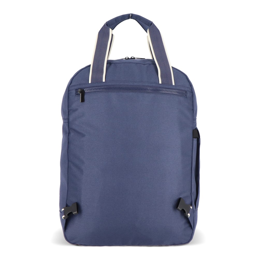 This stylish and practical backpack from the InSideOut Koli series is the perfect choice for anyone who travels frequently and values ​​functionality and sustainability. Made from eco-friendly rPET, a recycled material, the Koli backpack not only offers environmental benefits, but also a robust and long-lasting quality. The spacious main compartment contains a handy laptop compartment, while the front has a zippered front pocket and the side is equipped with a stretch pocket for a bottle or umbrella. The sturdy zipper ensures that you can easily open the main compartment and have direct access to the contents. The front pocket is ideal for companies looking for a place to have their logo or company name printed, making this bag an excellent promotional solution. By placing the shoulder straps in the back pocket, you can easily convert the backpack into a bag. This handy feature, combined with the sturdy handles, makes the Koli backpack not only a backpack, but also a practical bag.