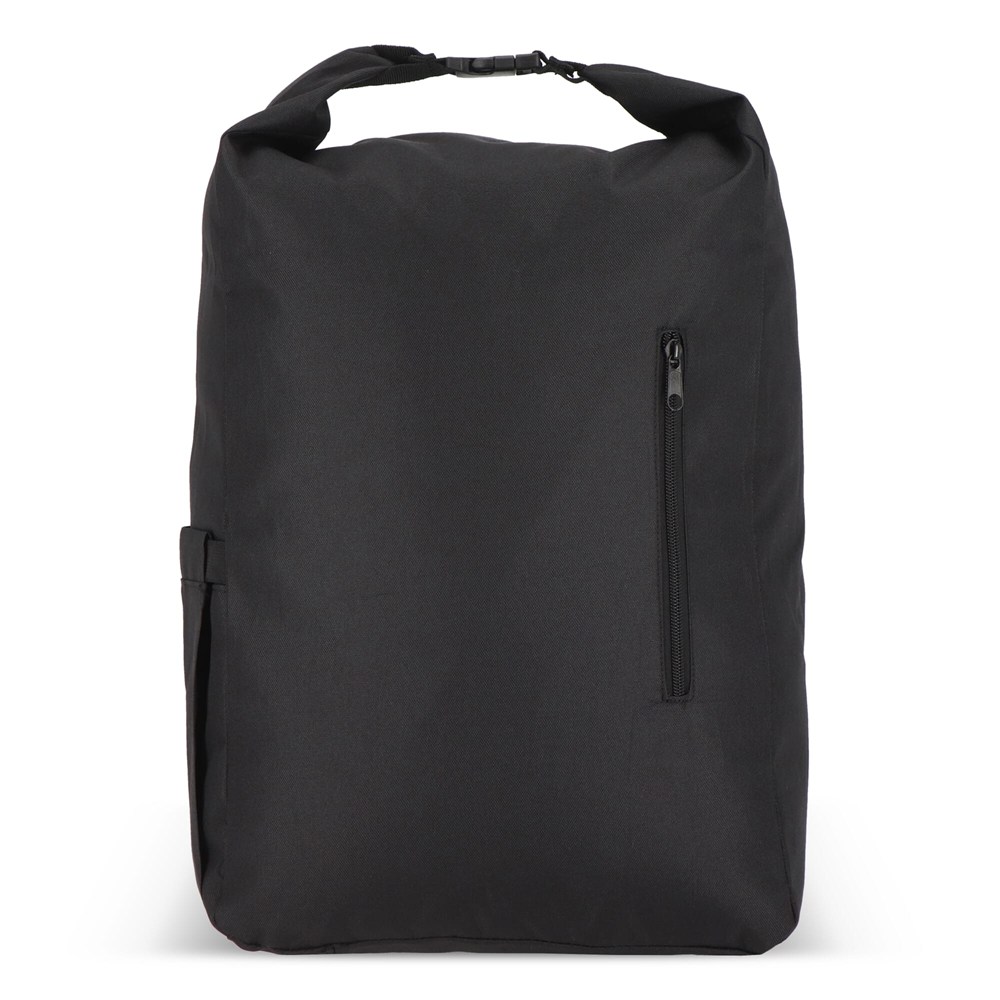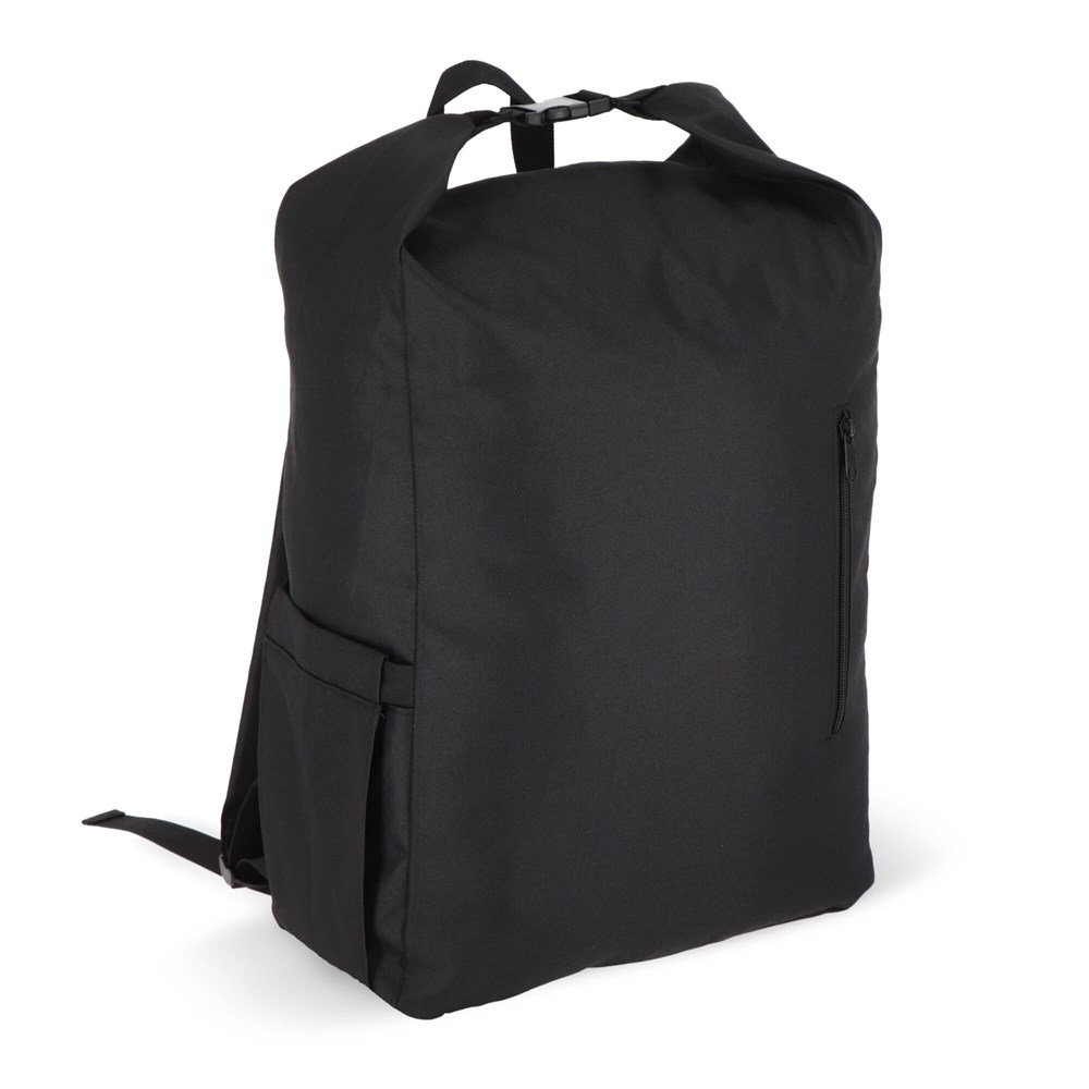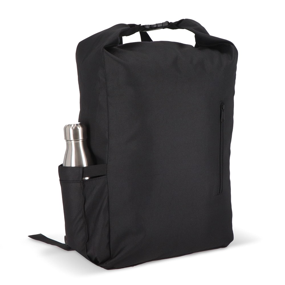 This handy backpack is made of recycled PET. It has adjustable, padded shoulder straps, a top grab handle and a front zippered pocket, ideal for smaller accesories. The side pocket is ideal for a waterbottle or umbrella.